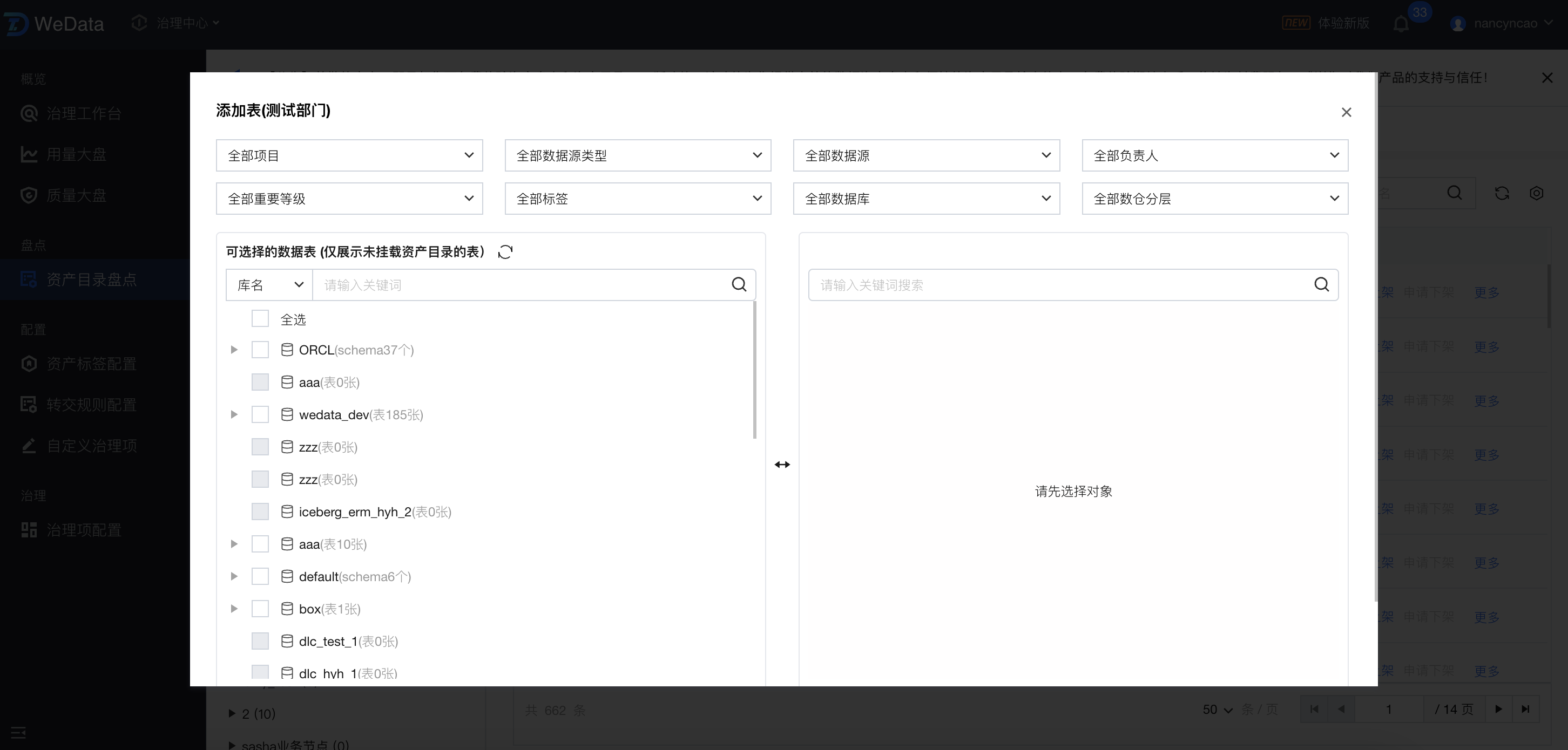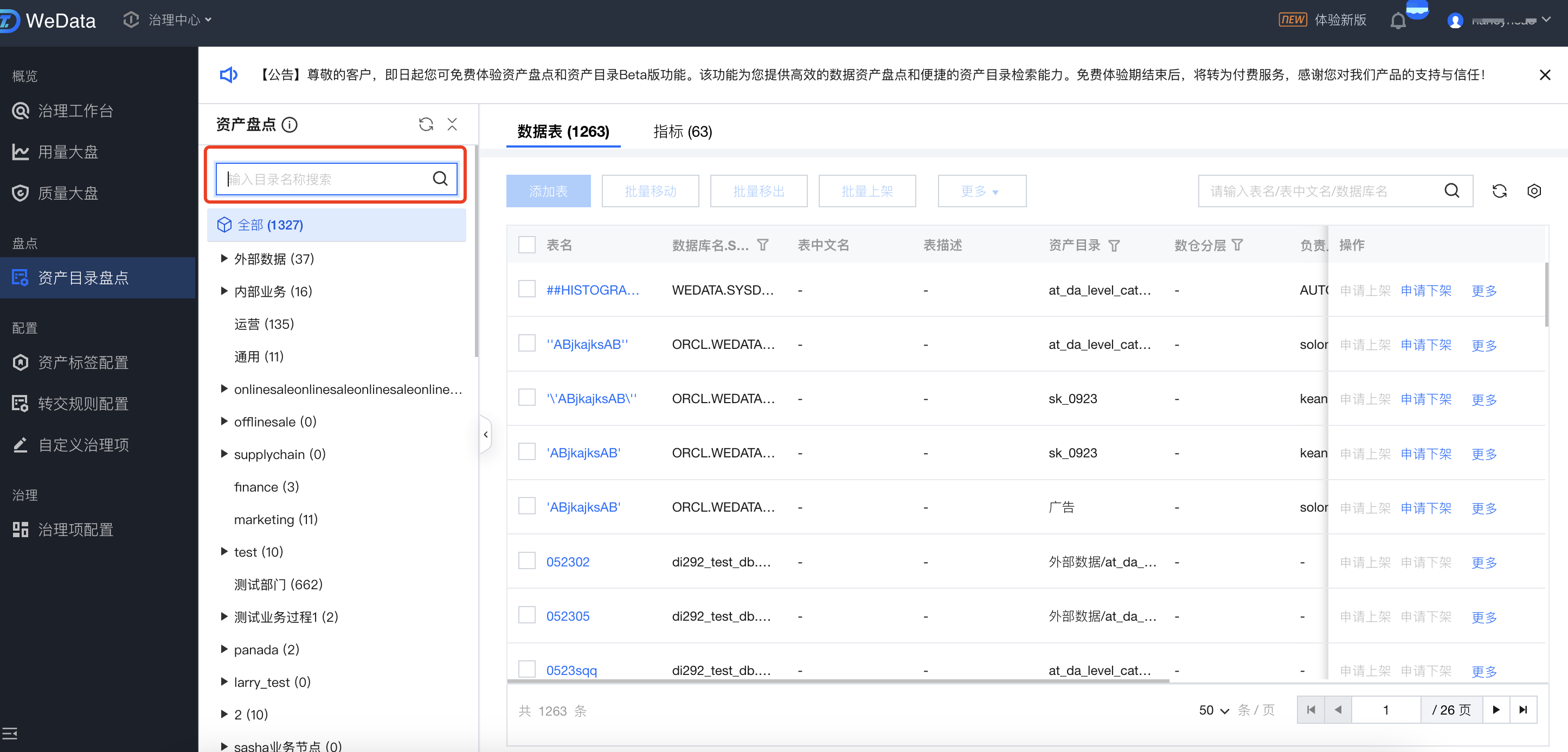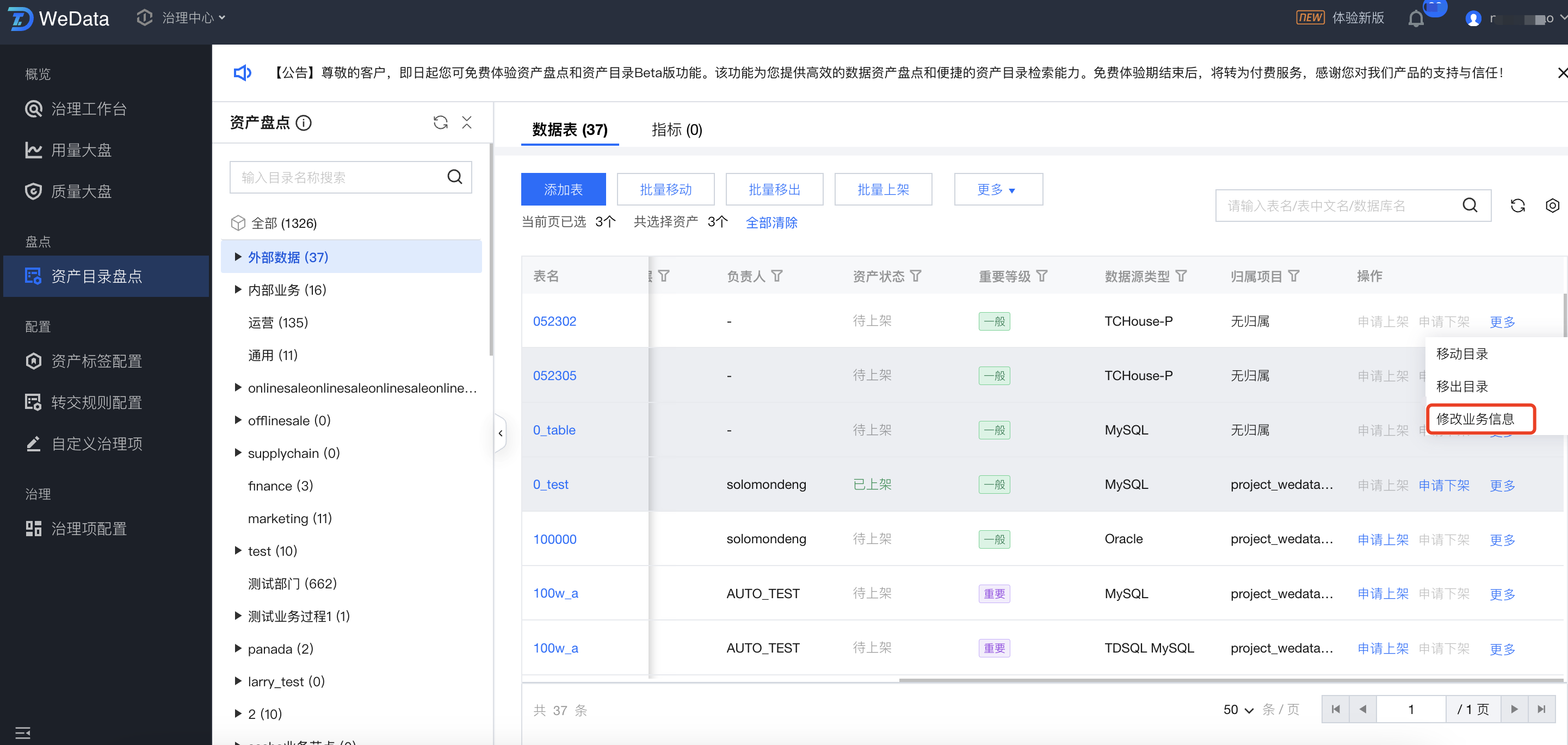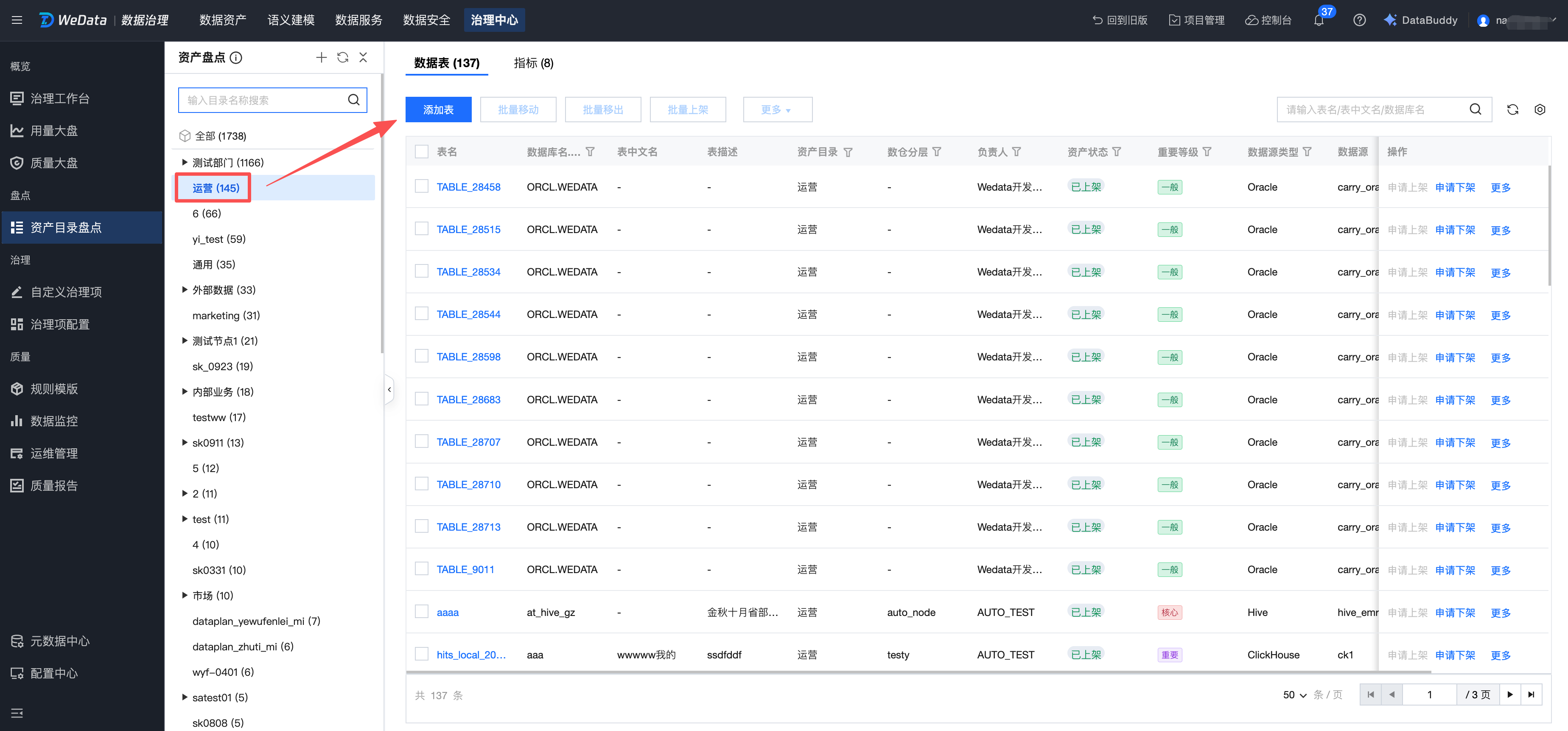 列表中,支持选中资产目录,对对应目录中的数据表进行盘点。