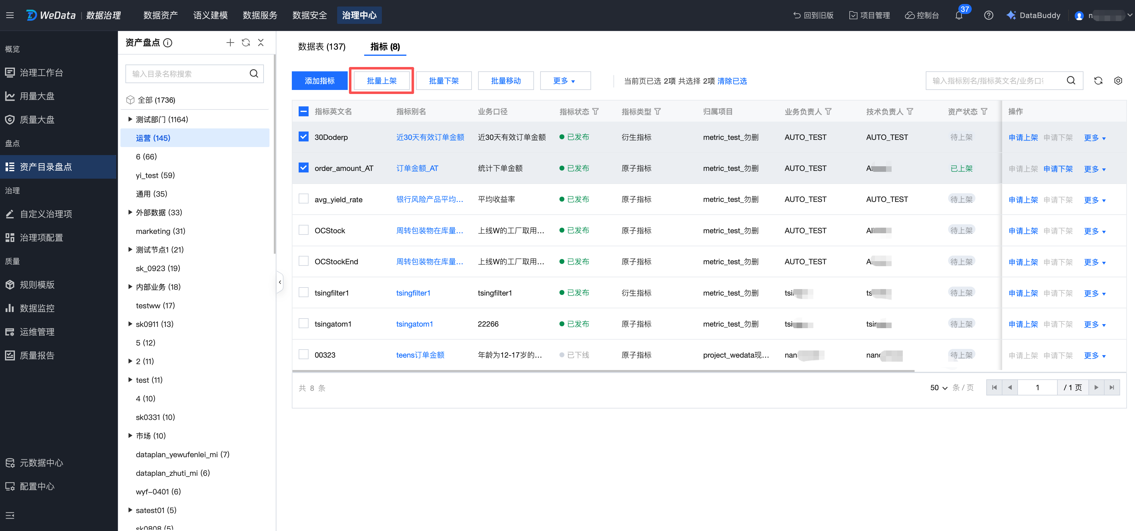 进入资产目录盘点页面,勾选需要发布的资产,单击顶部批量上架,即可将资产一次性进行批量上架。