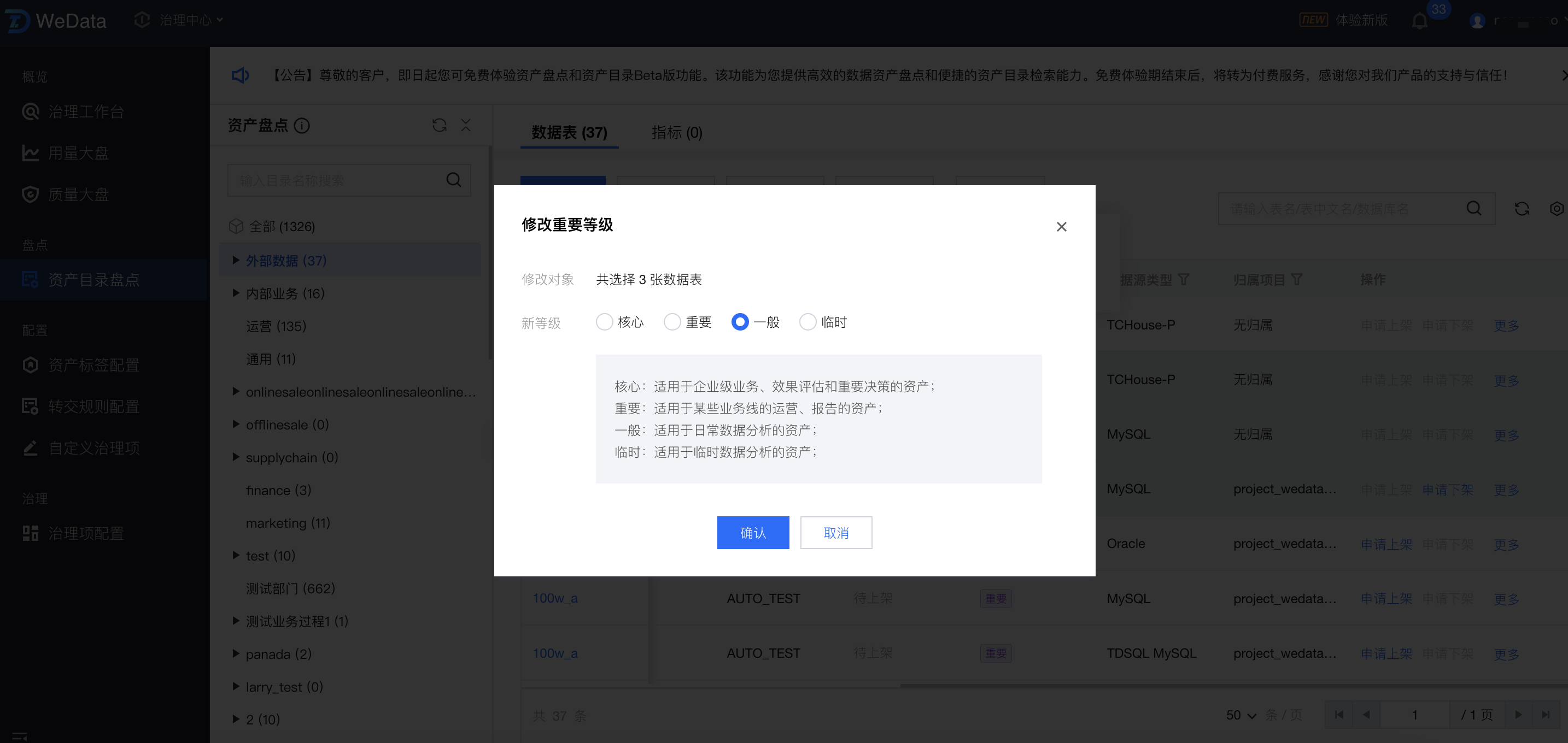 进入修改重要等级页面,建议按照业务逻辑分类,修改重要等级便于之后检索与管理,修改完成后,单击确认。