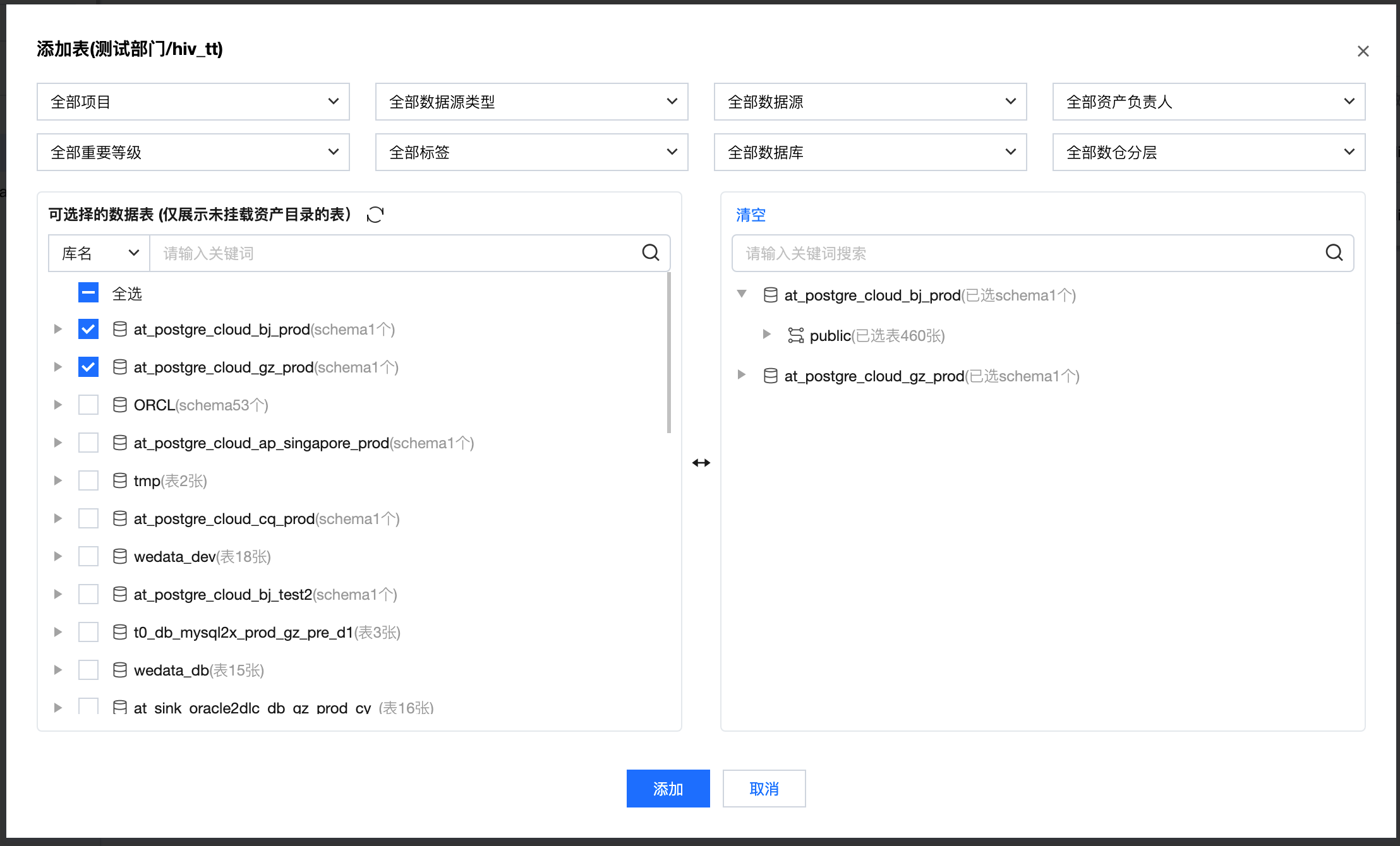 单击添加按钮,在弹窗中选择数据表。支持通过项目、数据源类型、数据源、表负责人、重要等级、标签、数据库、数仓分层、关键词等快速筛选表;也可通过右侧树结构直接选择库表。