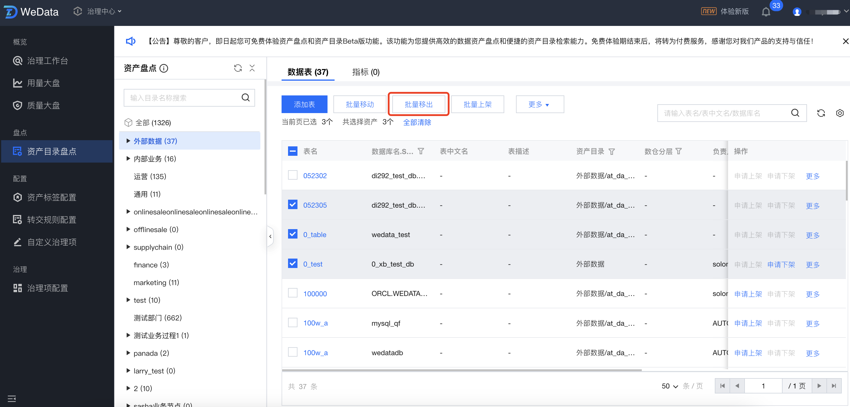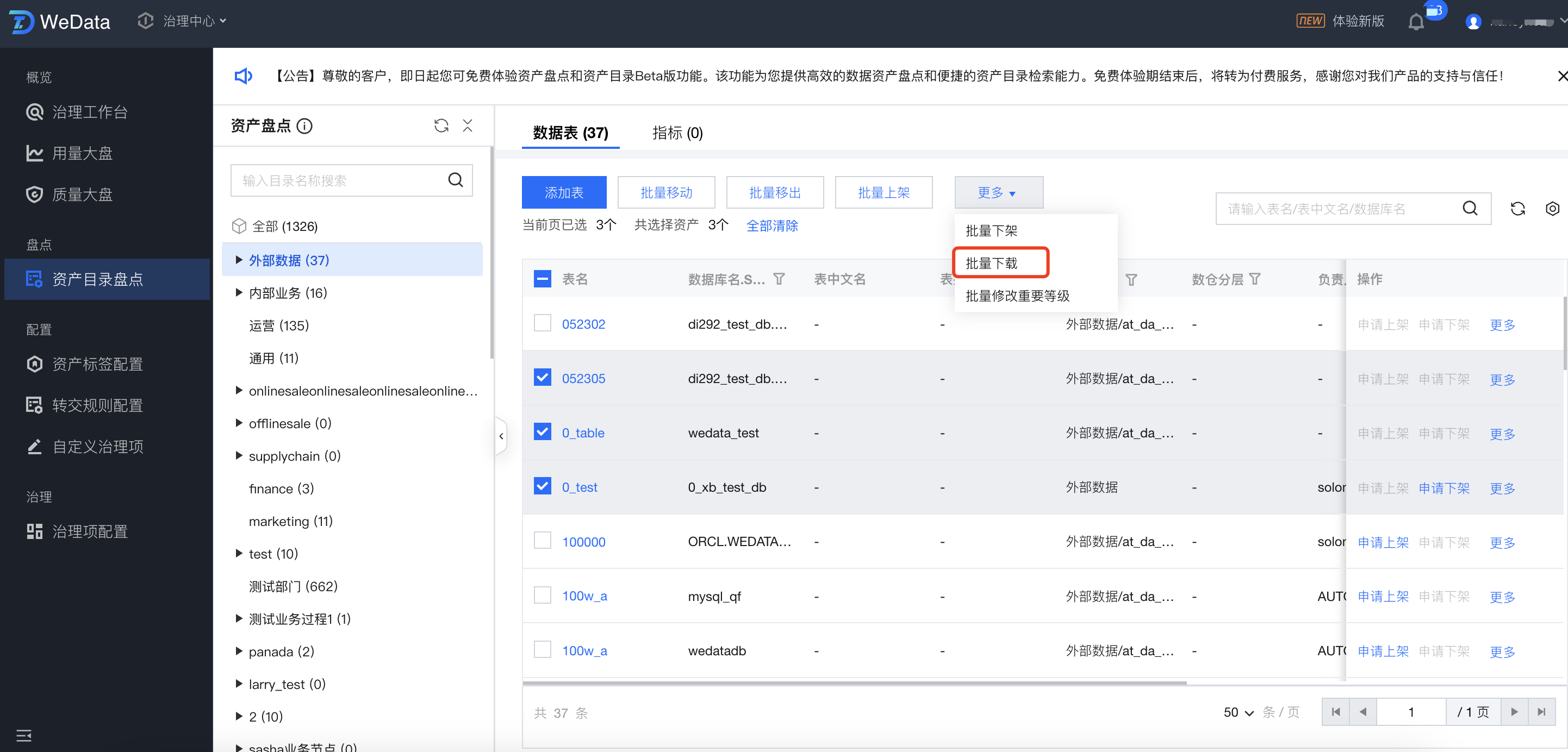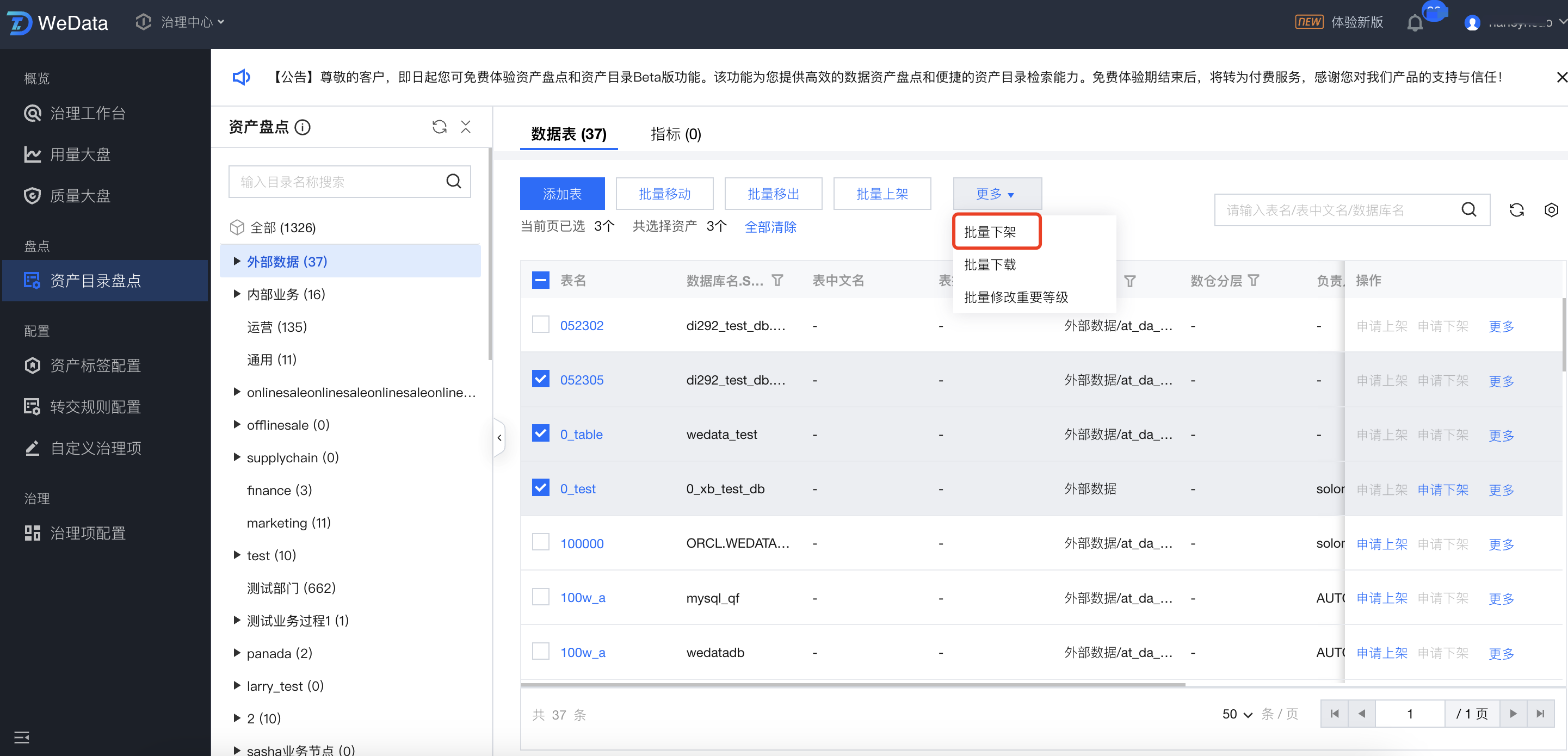 进入资产目录盘点页面,勾选需要下线的资产,单击批量下架,即可将资产一次性进行批量下架。
