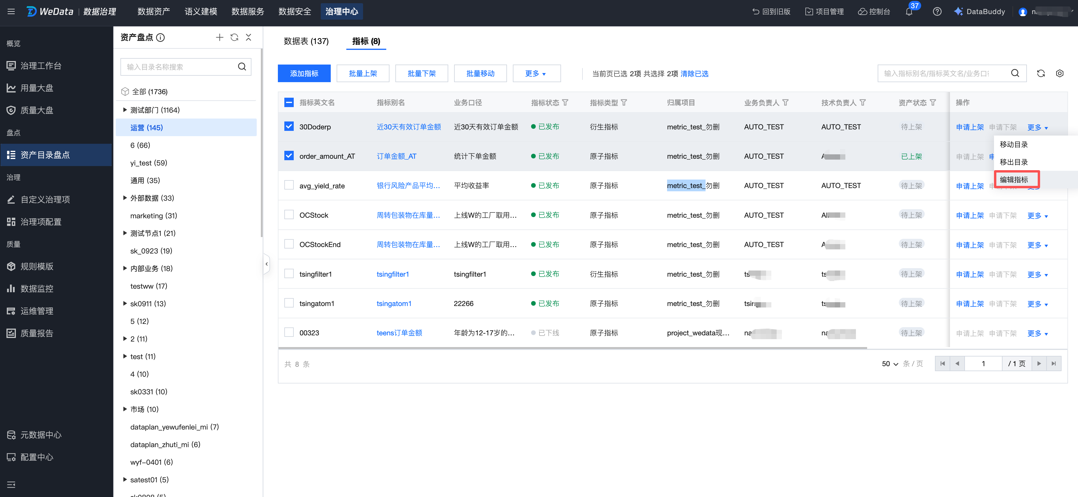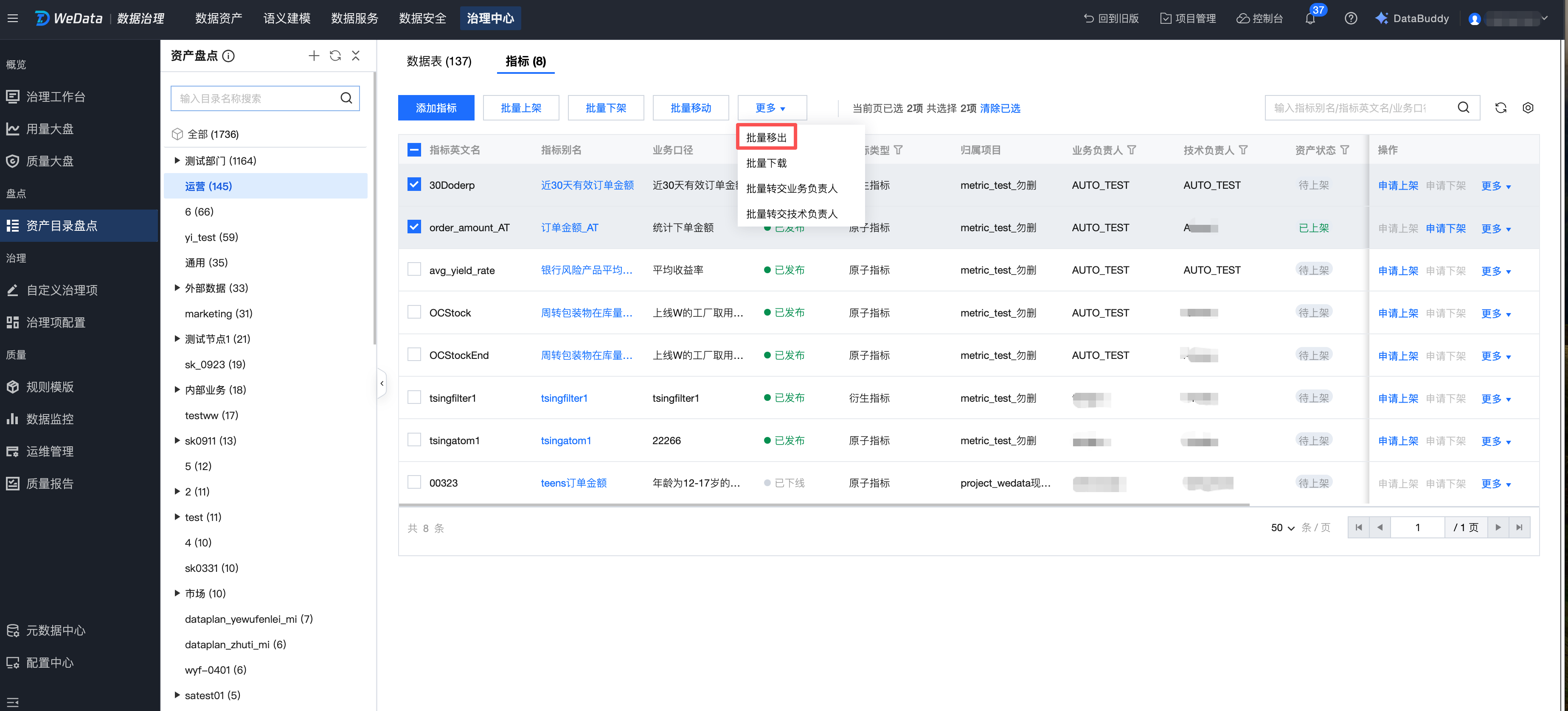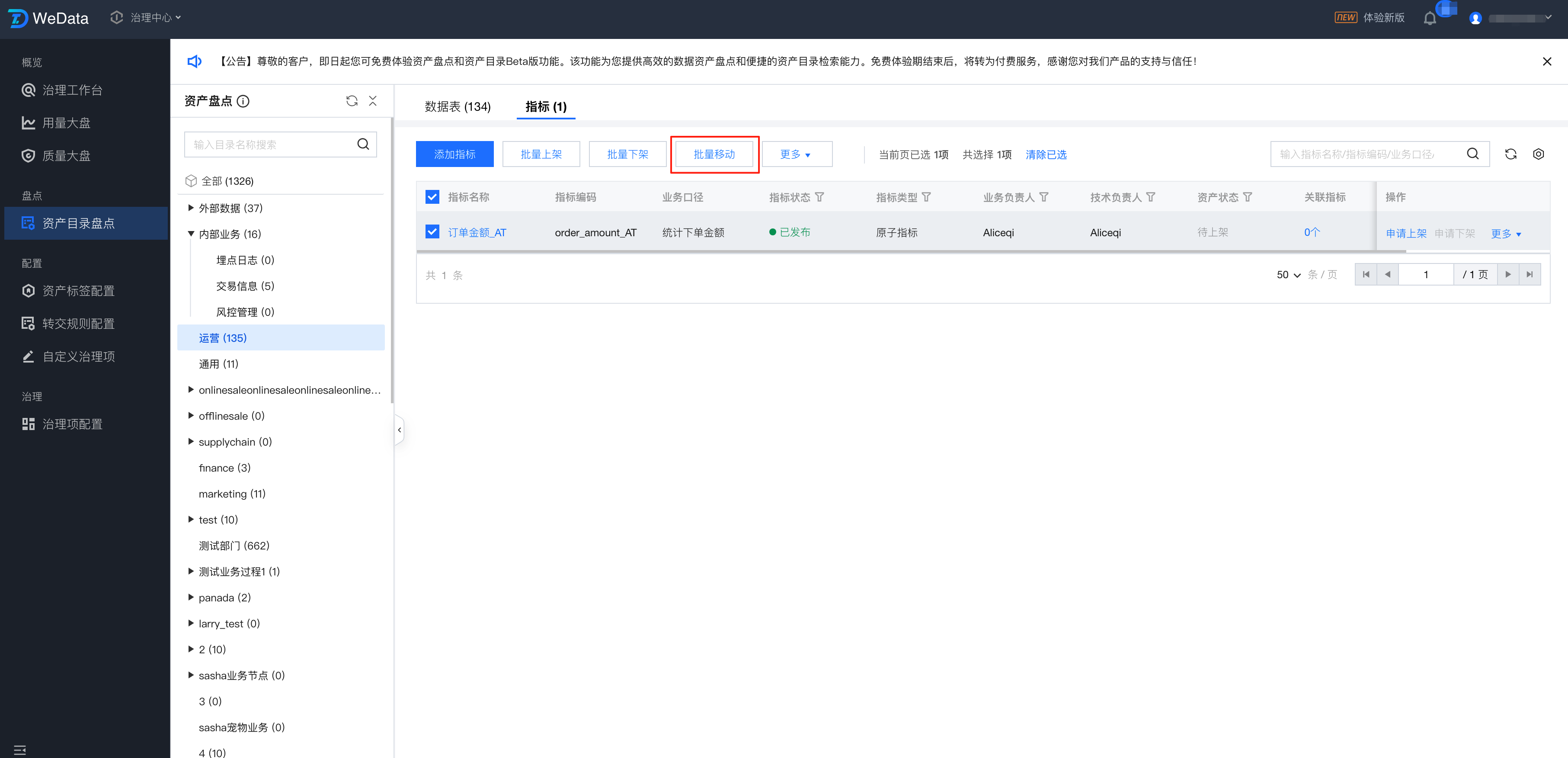 进入资产目录盘点页面,勾选需要移动的指标,单击顶部批量移动,即可将指标批量移动到其他目录节点下