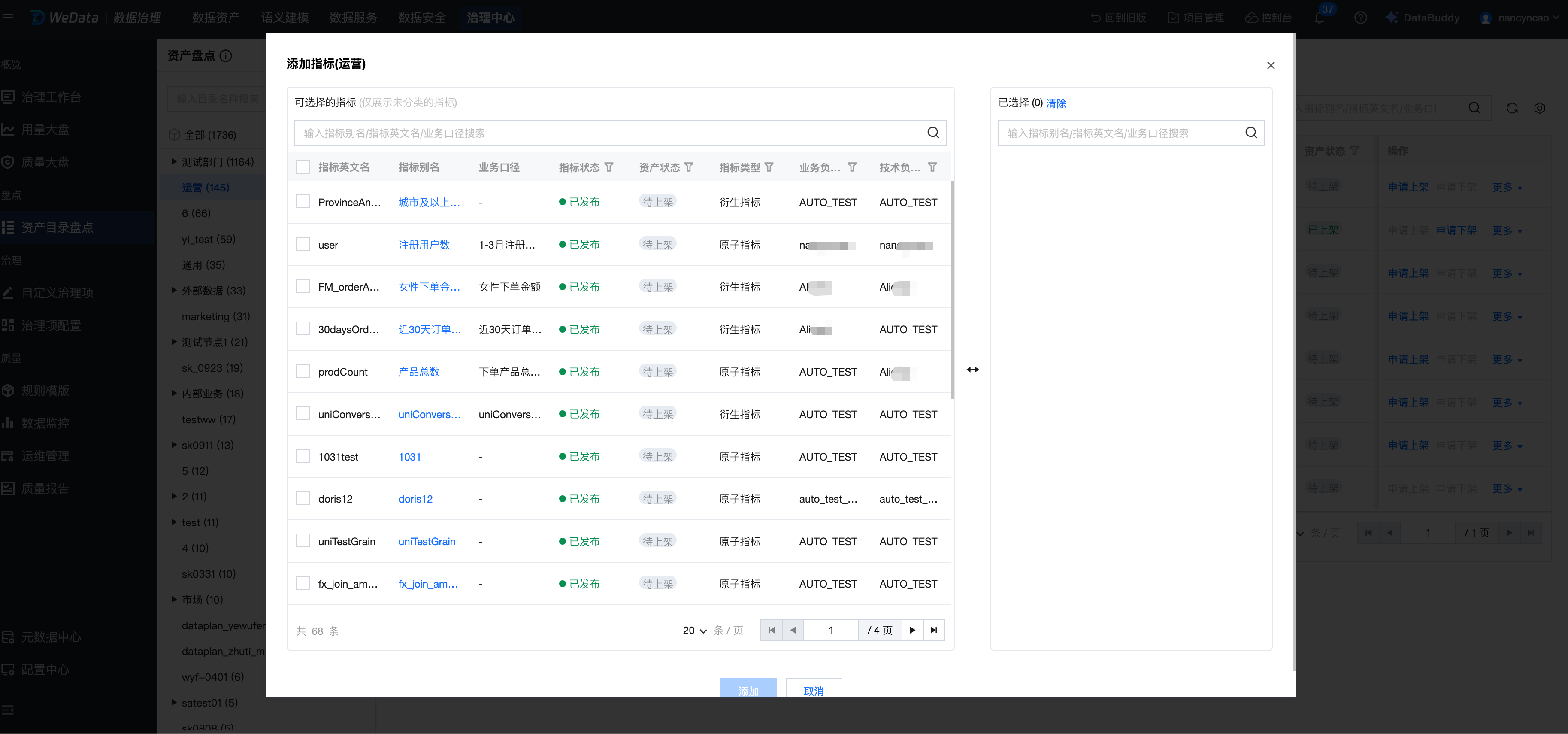 列表中,支持选中资产目录,对对应目录中的指标进行盘点。