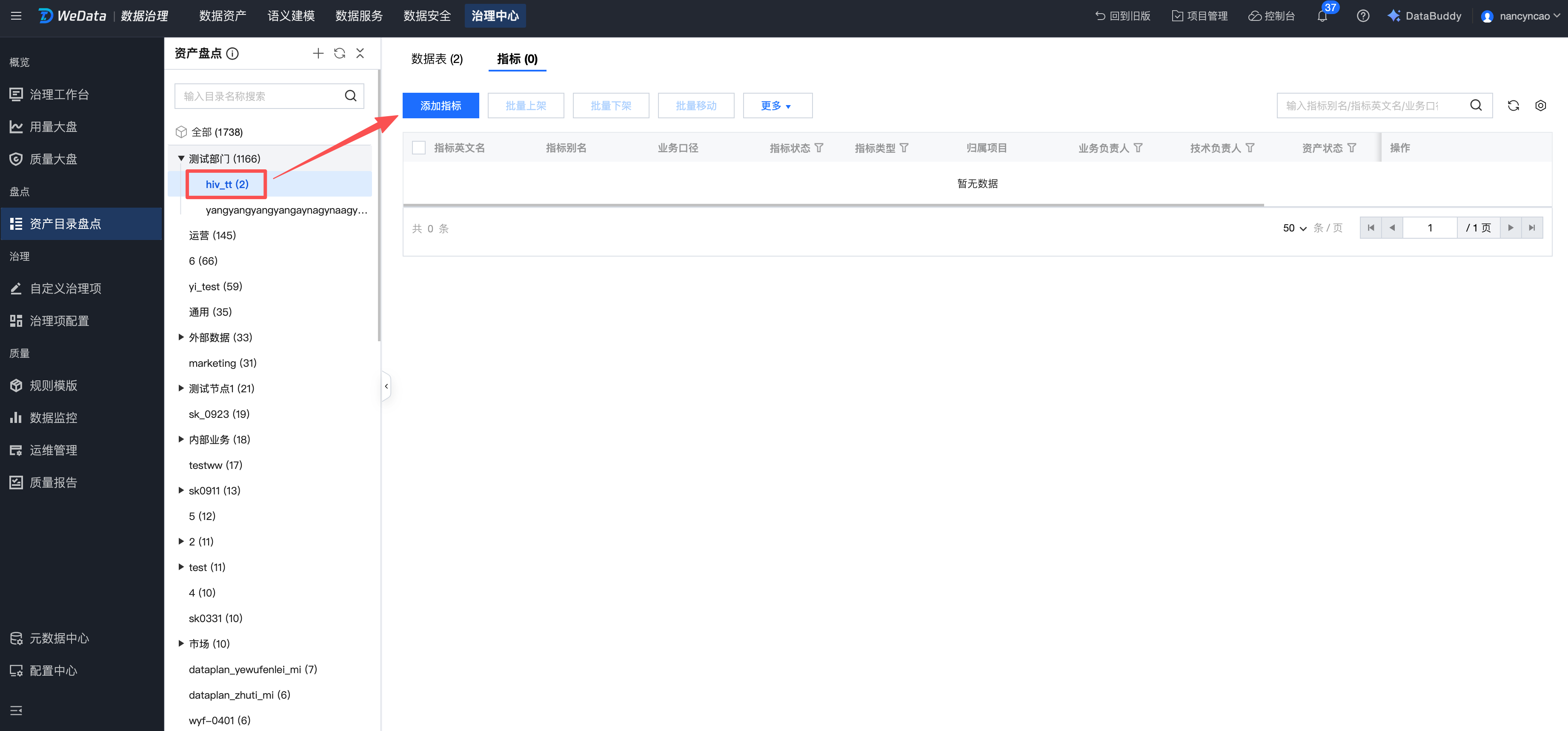 进入资产目录盘点页面,选择目标目录,然后单击添加指标。
