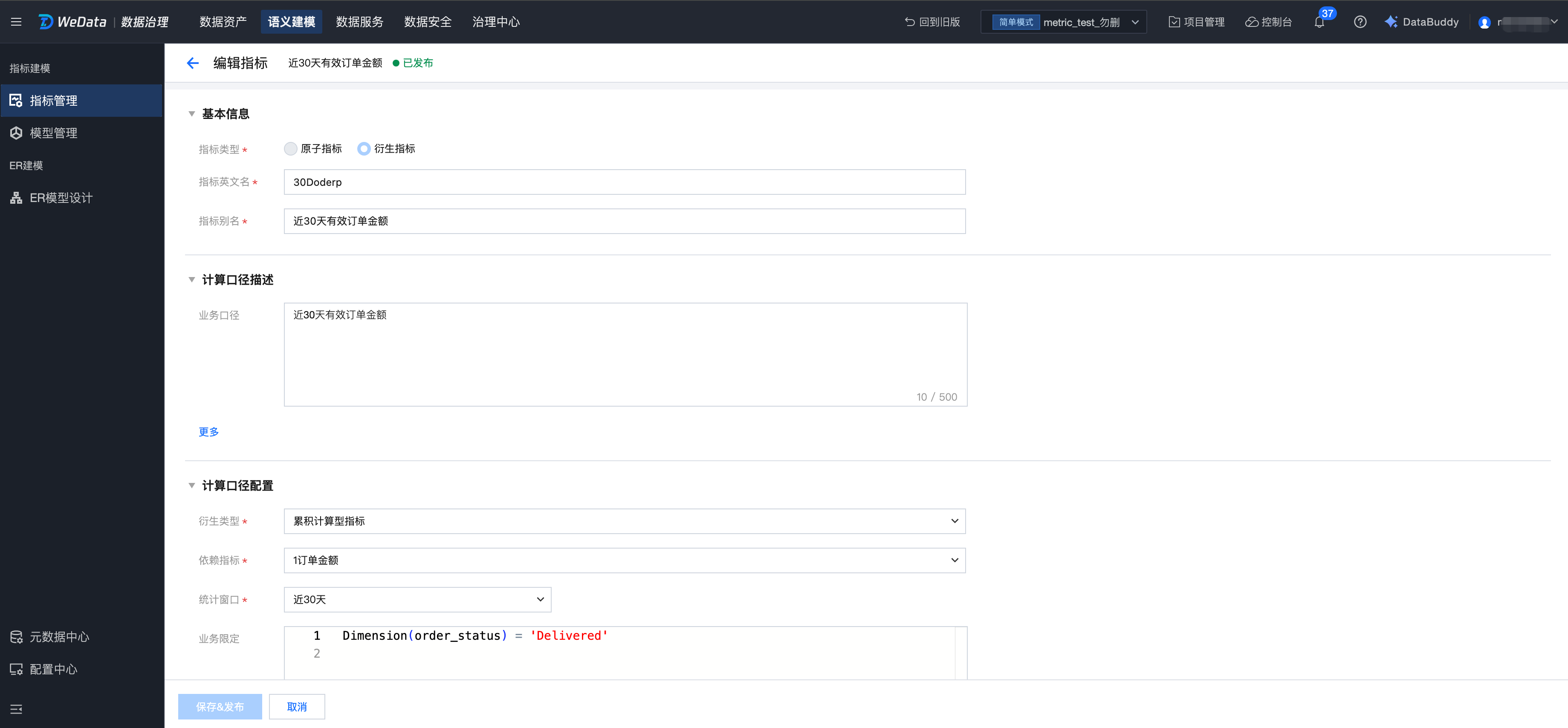 跳转到指标建模页面,编辑指标。