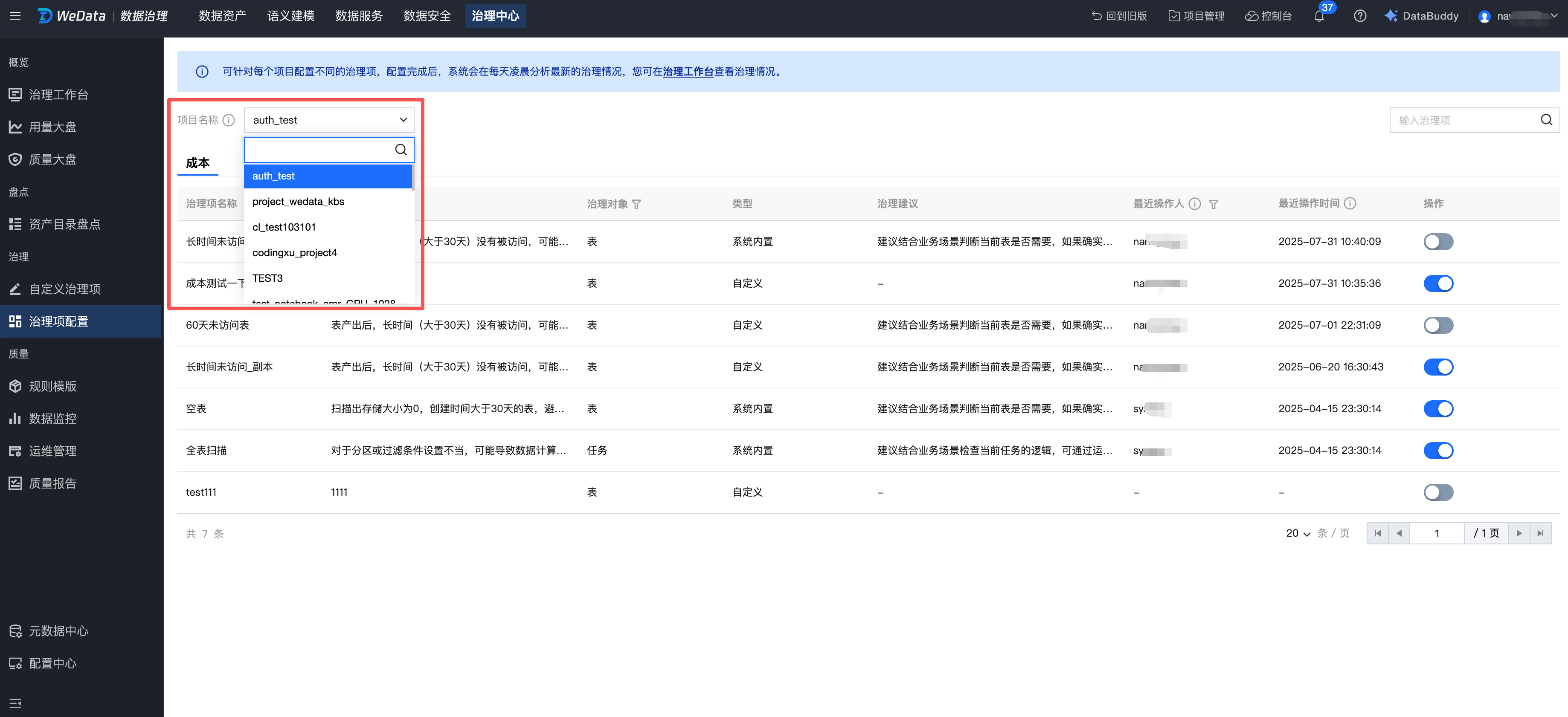 不同项目治理维度可能存在不同,本功能支持您按照项目名称维护治理项,并支持根据项目开启或者禁用治理项。