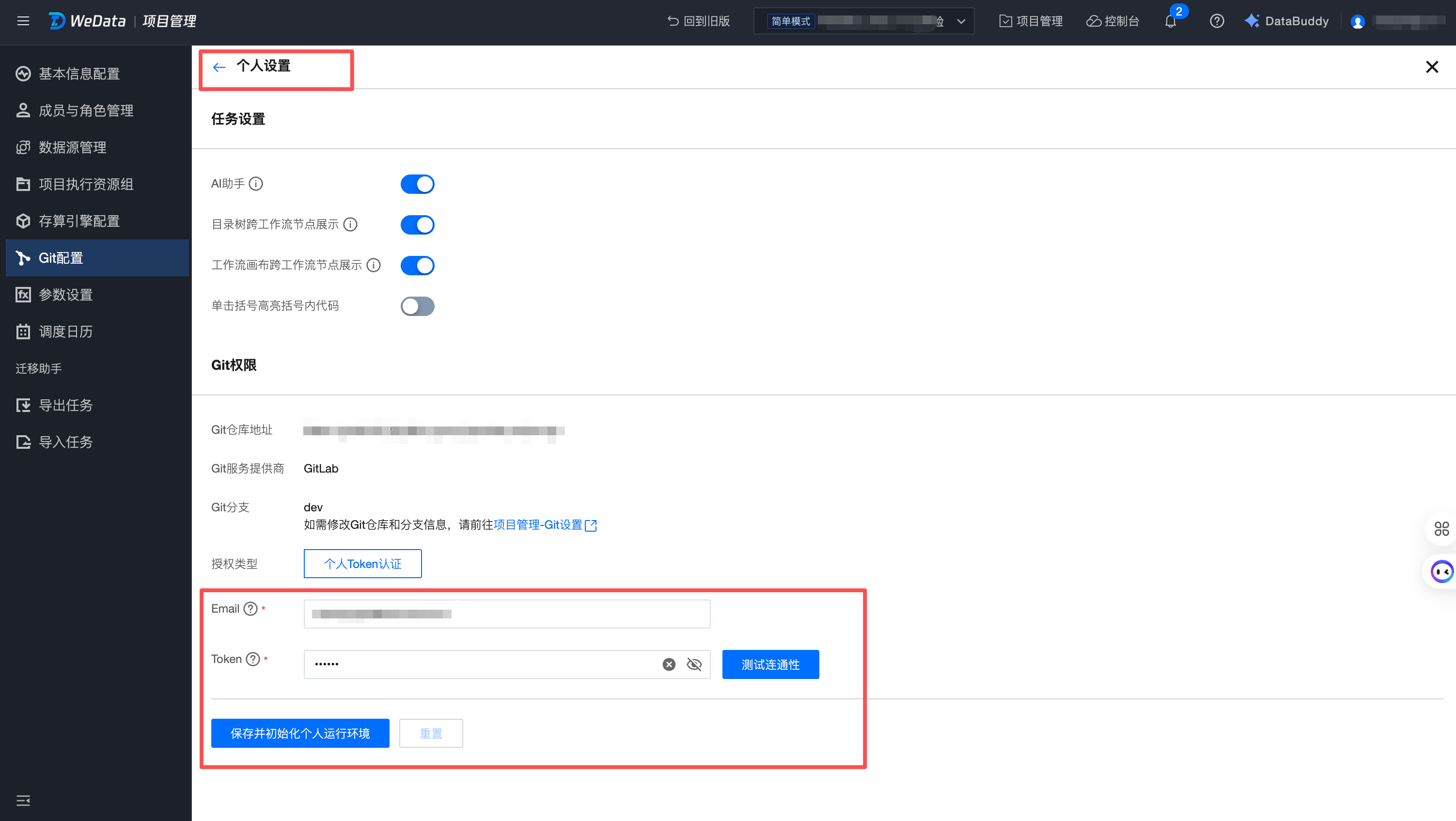 单击右上角用户中心 > 个人设置,配置个人 Git 权限,填写 Email 和 Token 信息后,单击保存并初始化个人运行环境。