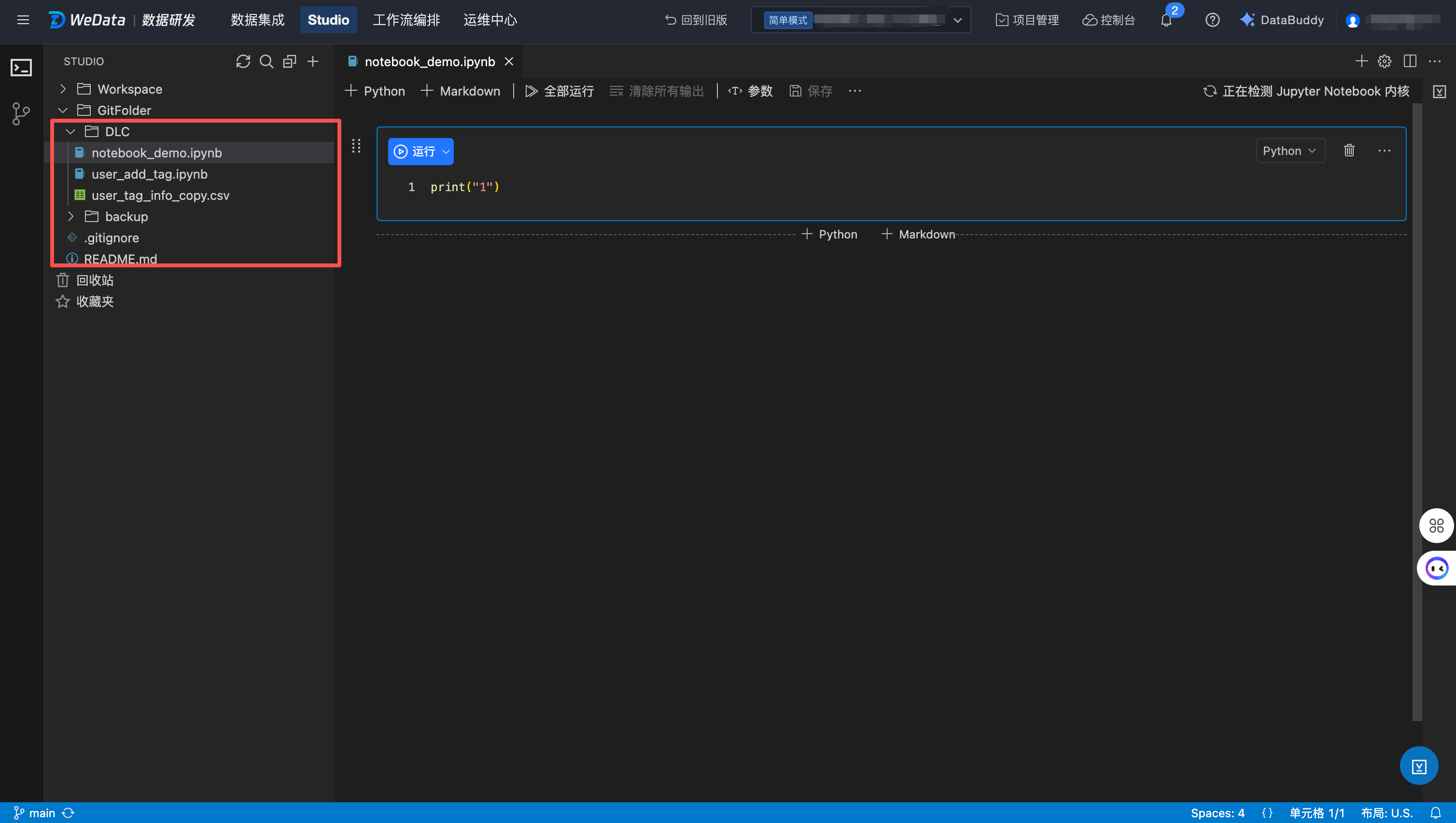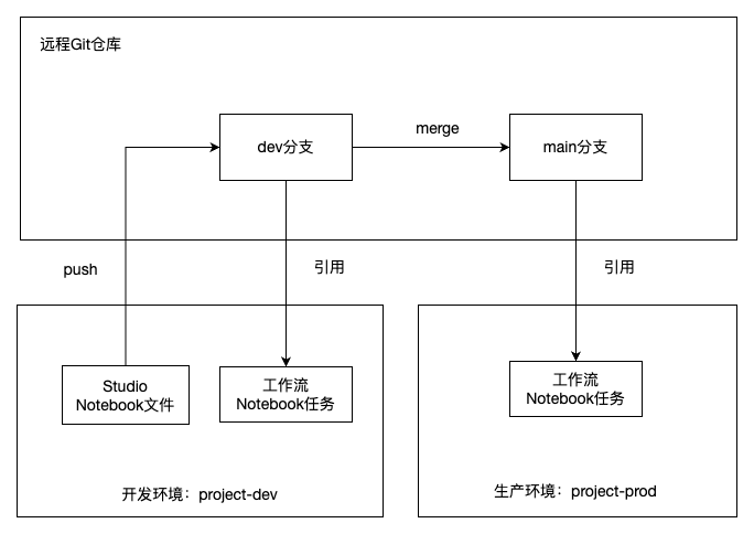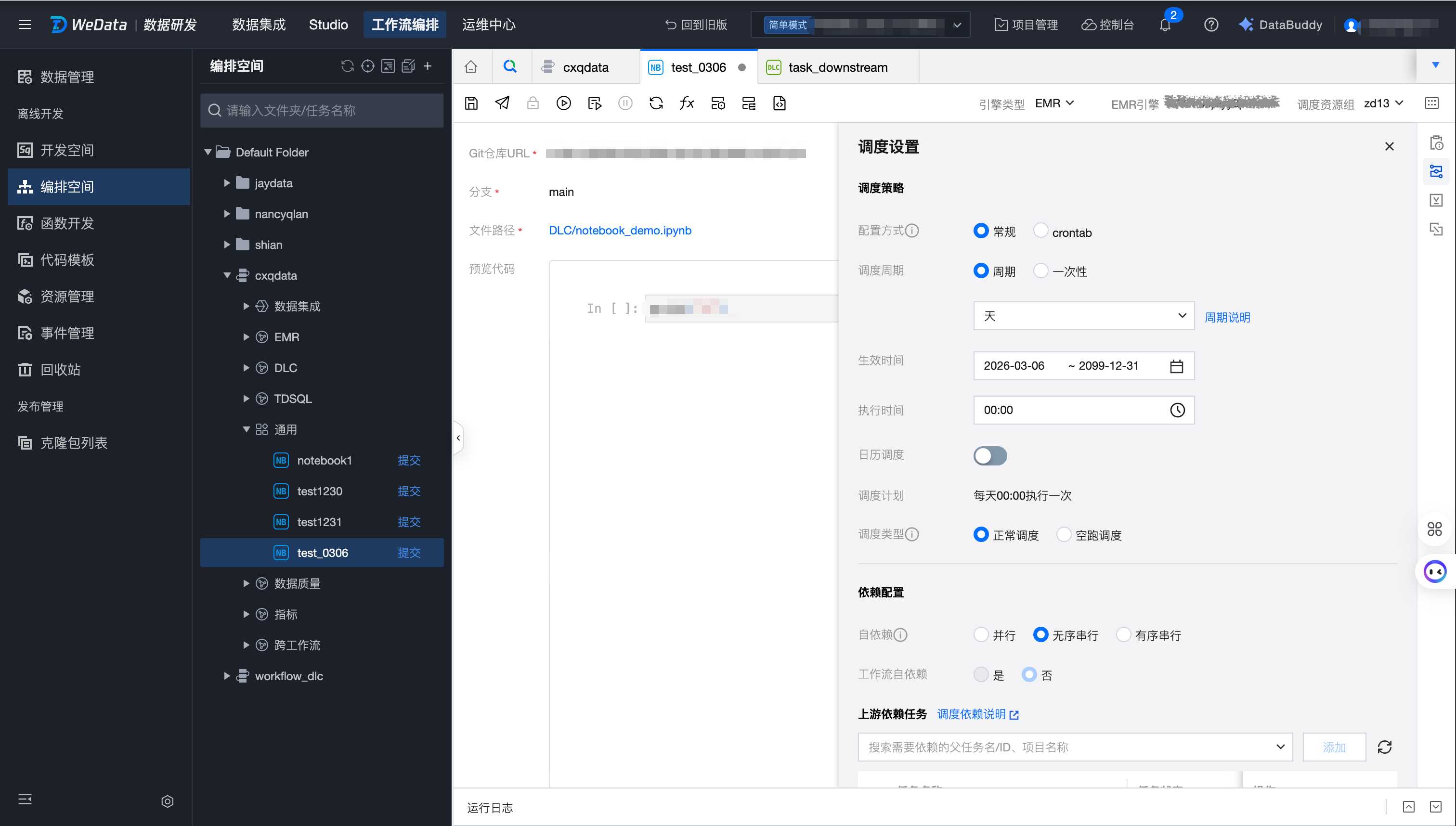 进入工作流编排 > 编排空间,创建工作流和 Notebook 任务,引用远程 Git 仓库 main 分支中的 Notebook 文件。