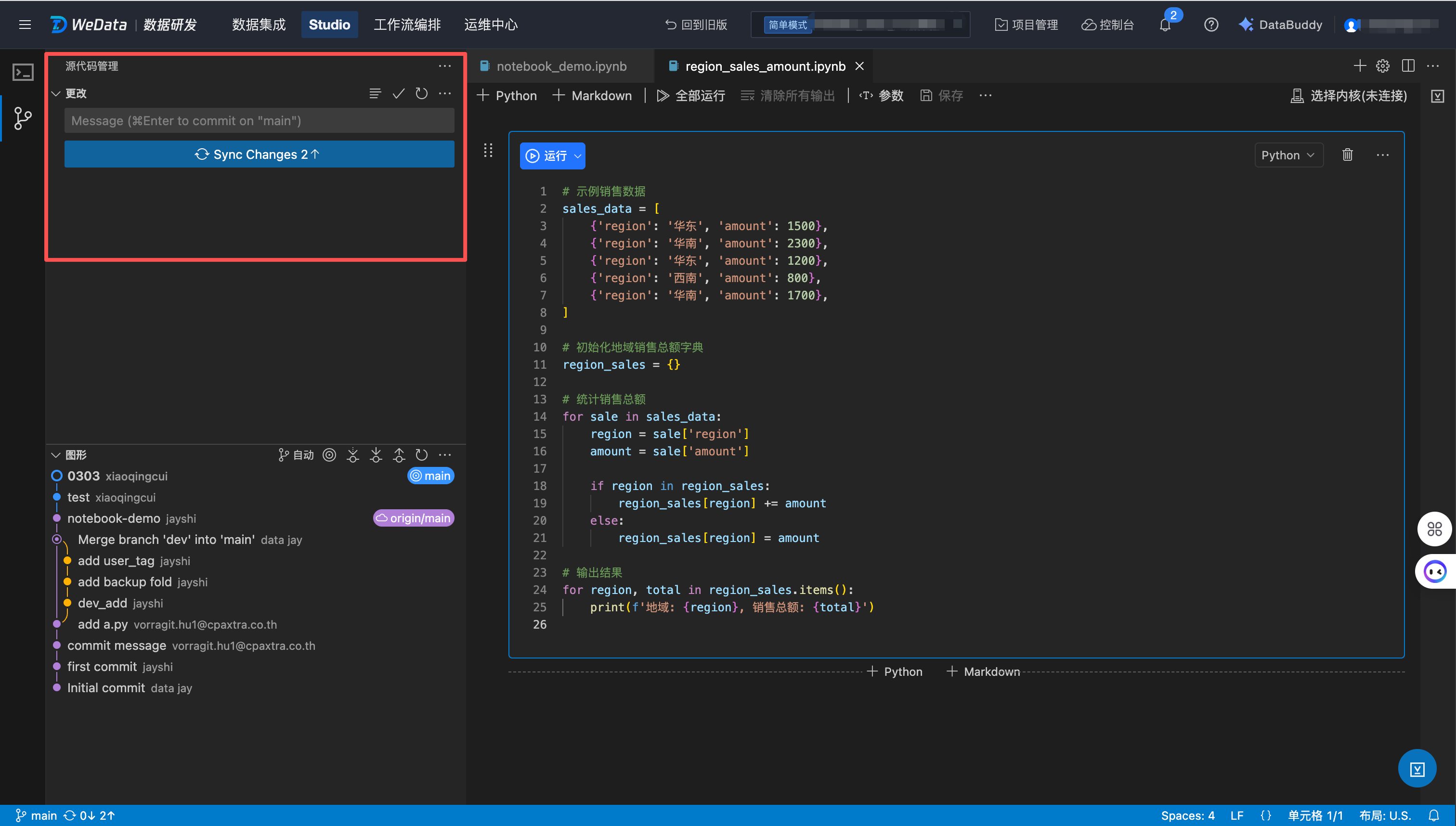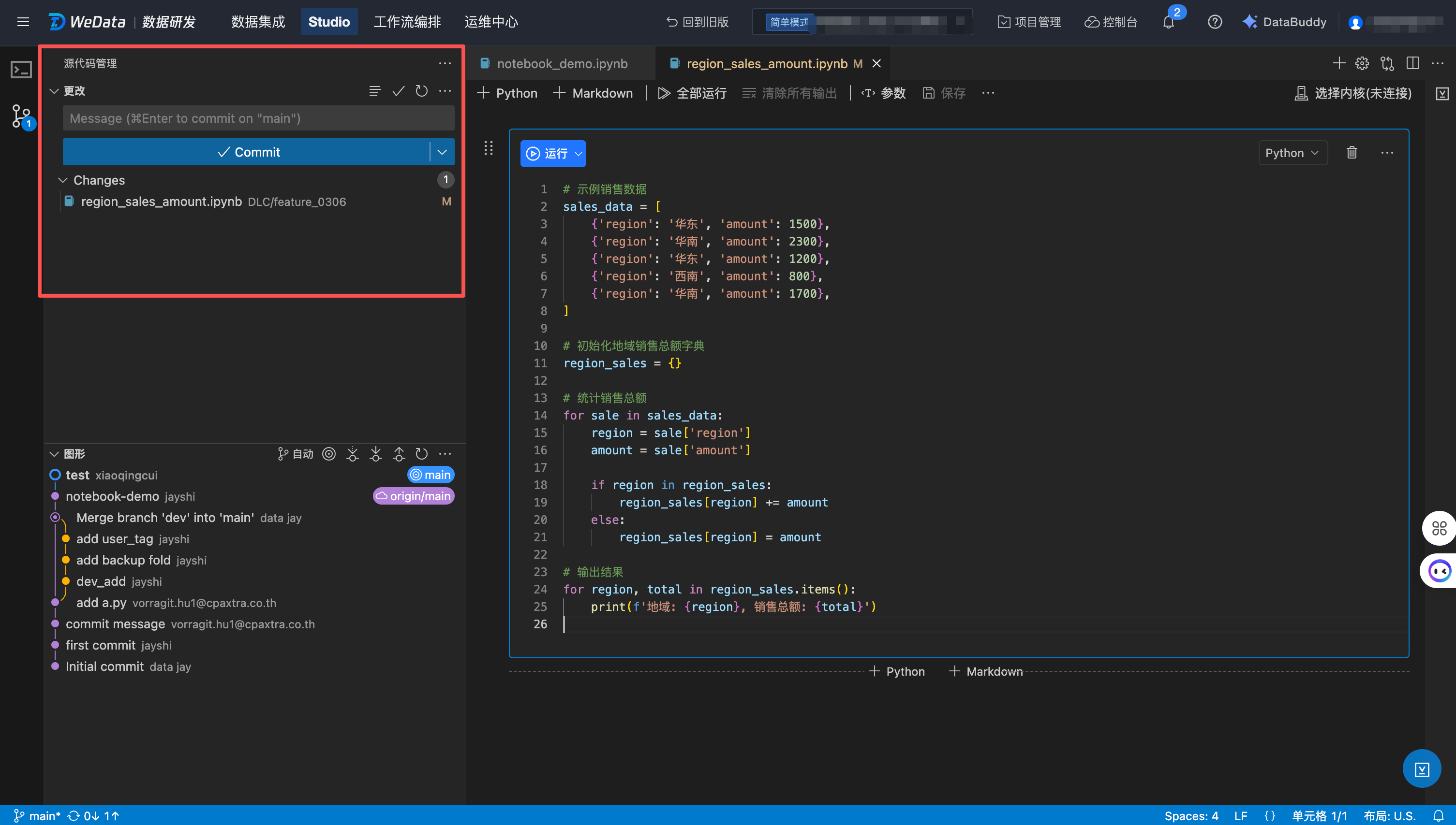 下面以一个简单的例子,对如何在 WeData 中使用 Git 功能进行团队协作进行阐述。