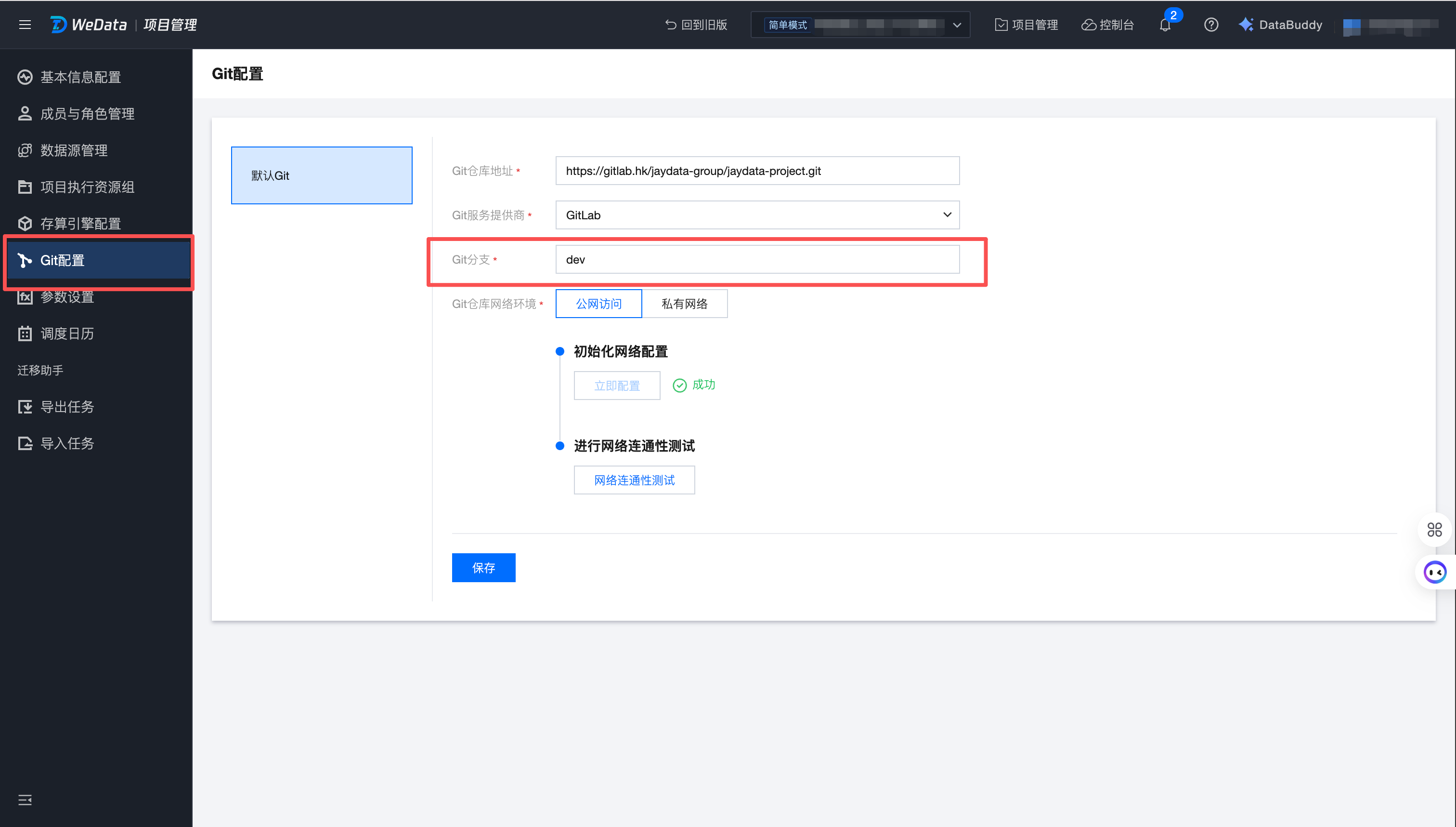 选择 Git 仓库所在的网络环境,进行网络配置的初始化和连通性测试,连通成功后保存配置信息。