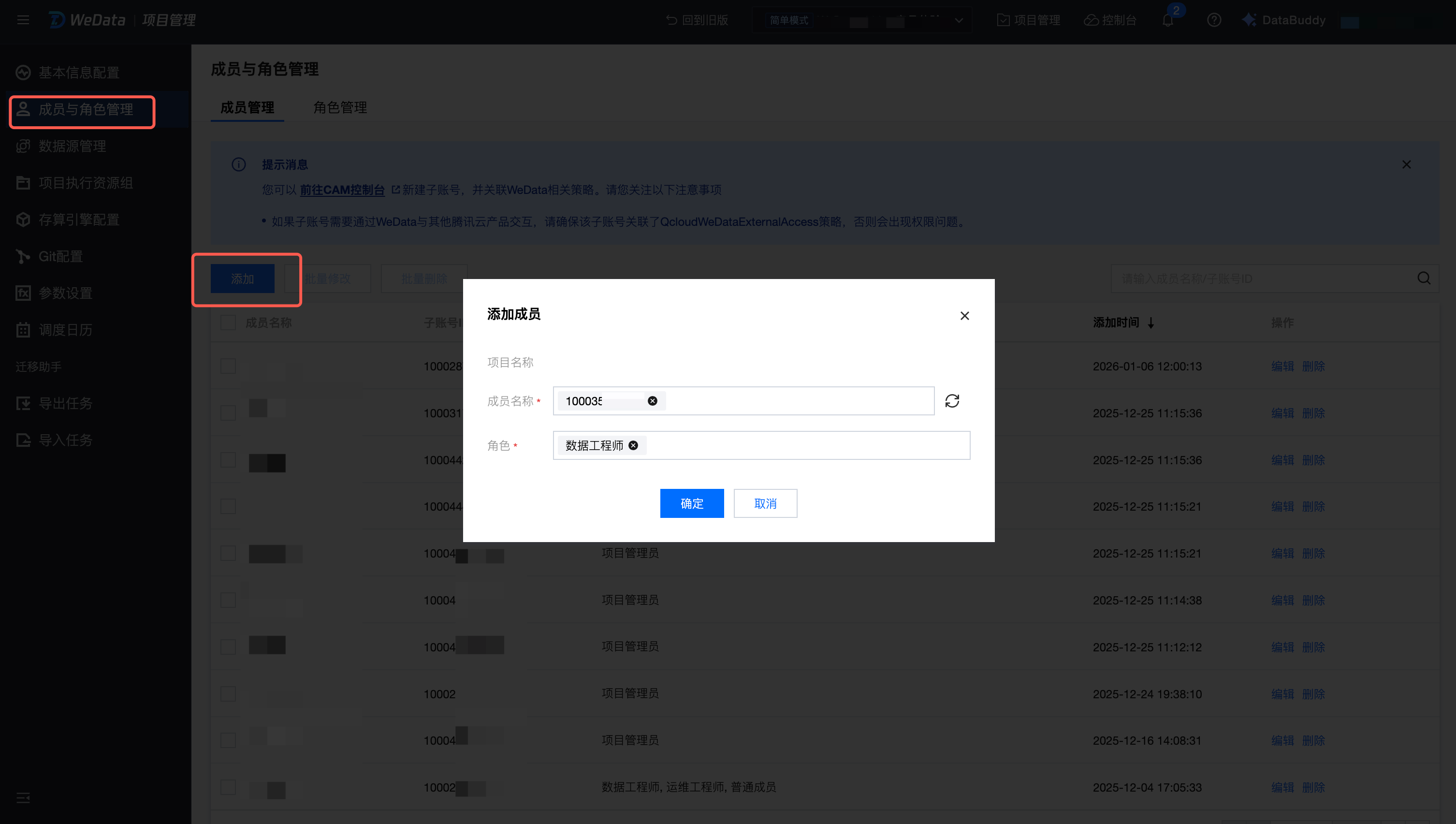 进入项目管理 > 成员与角色管理,将用户B加入两个项目,并且授予数据工程师角色。
