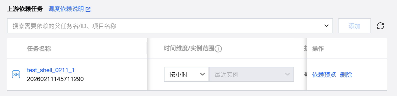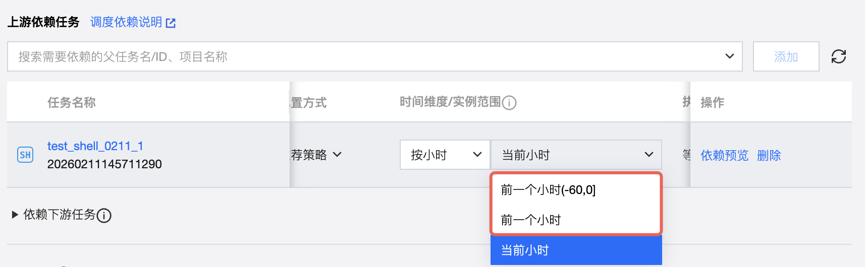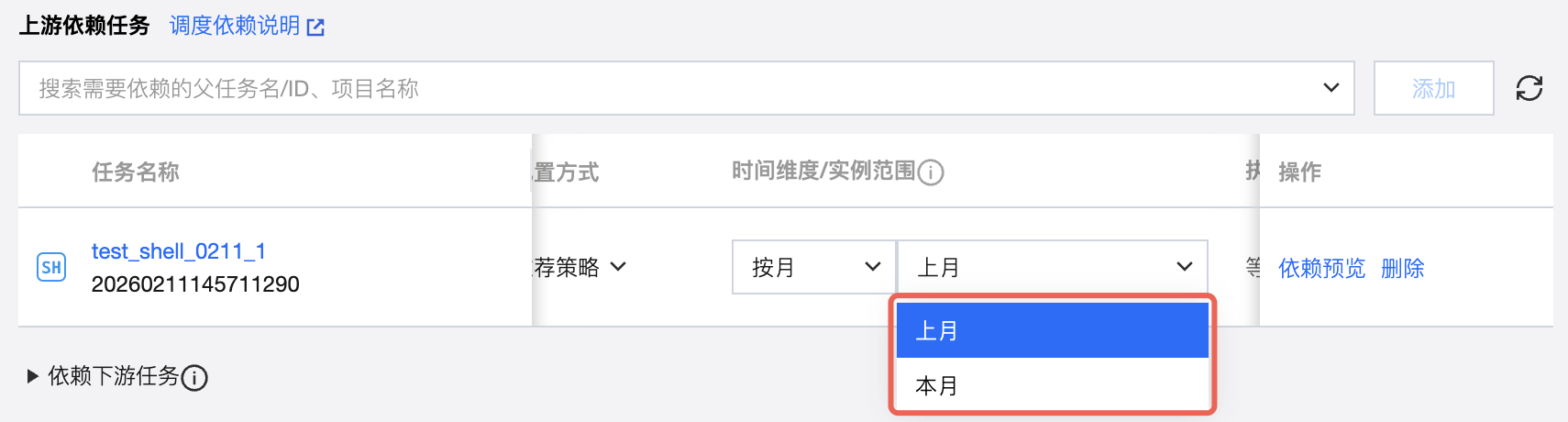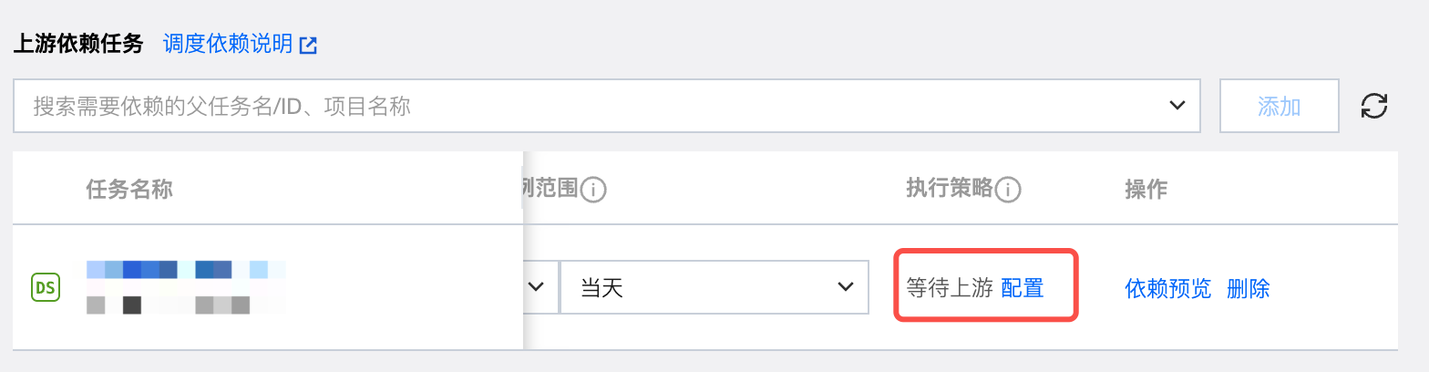 支持通过搜索任务名称、任务 ID、项目名称查找需要配置的上游依赖任务。