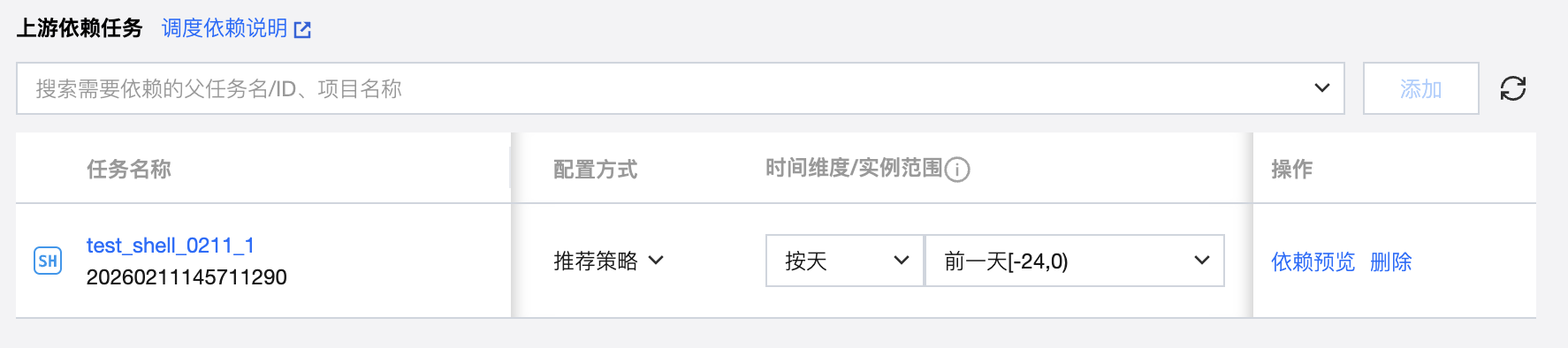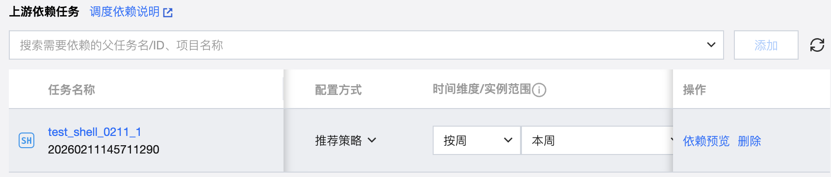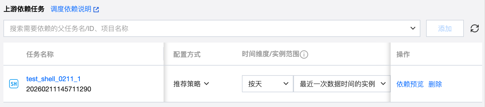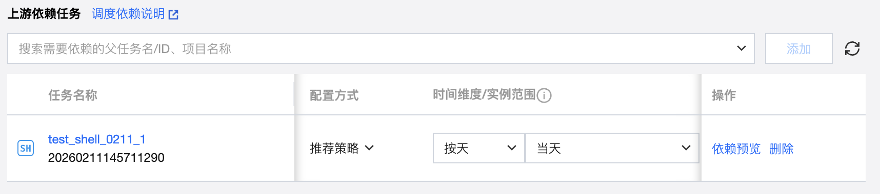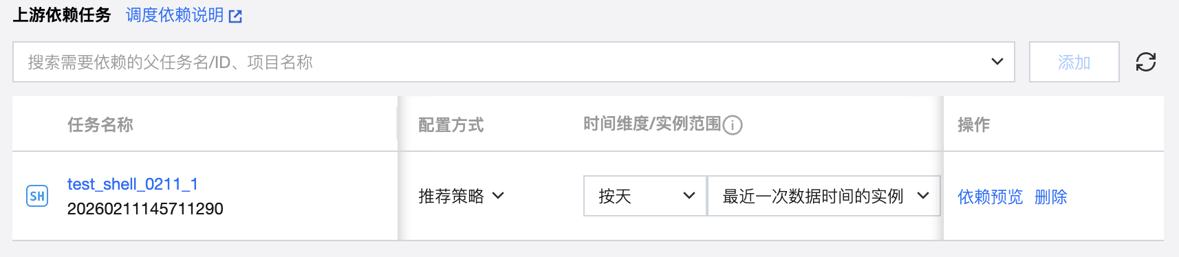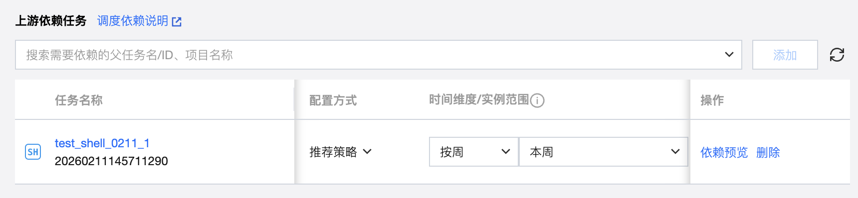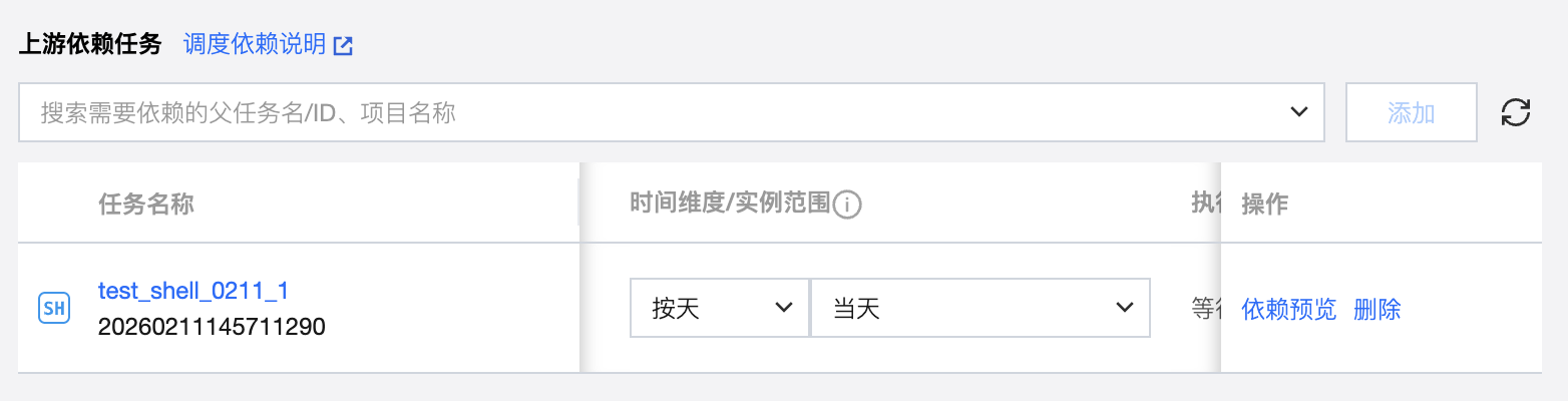 将搜索到的任务添加为依赖任务时,在依赖任务列表中会显示对应任务的信息,包括任务名称、任务状态、调度周期、负责人、所属工作流、所属项目、时间维度、实例范围、执行策略以及删除操作。