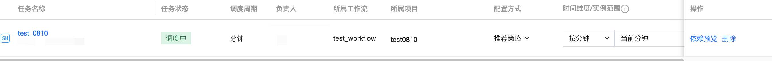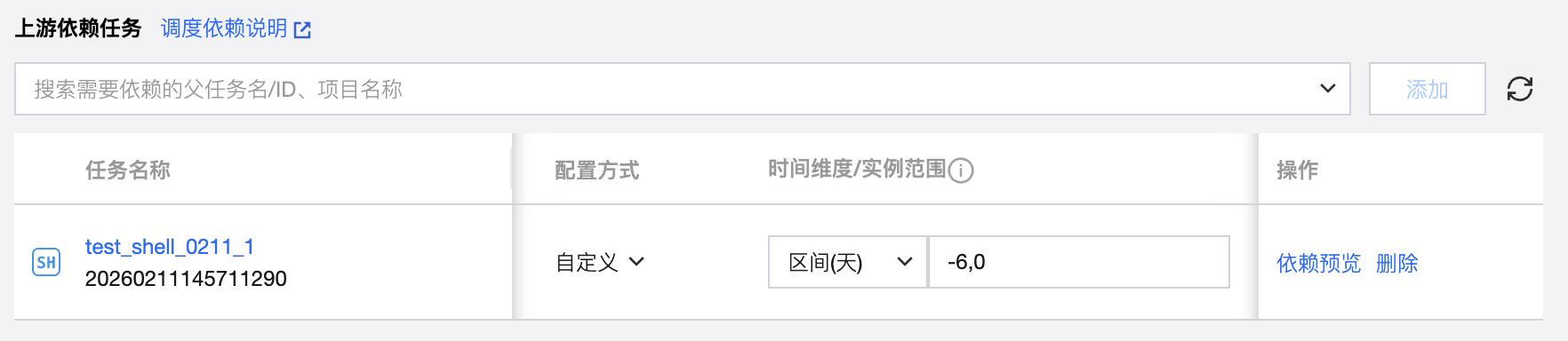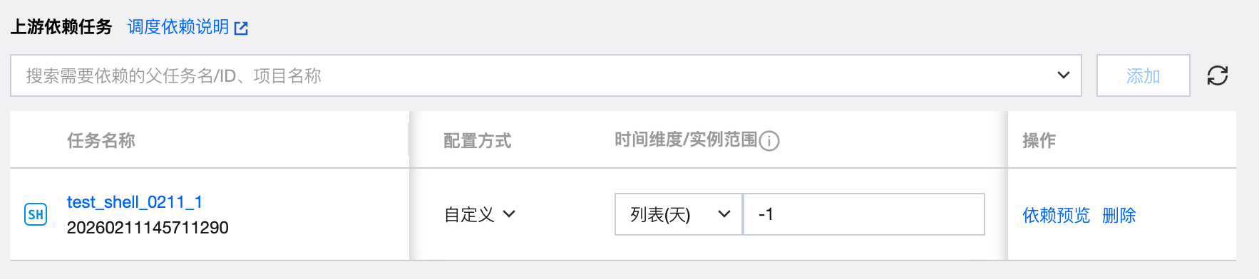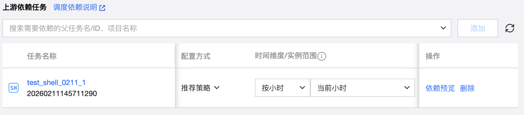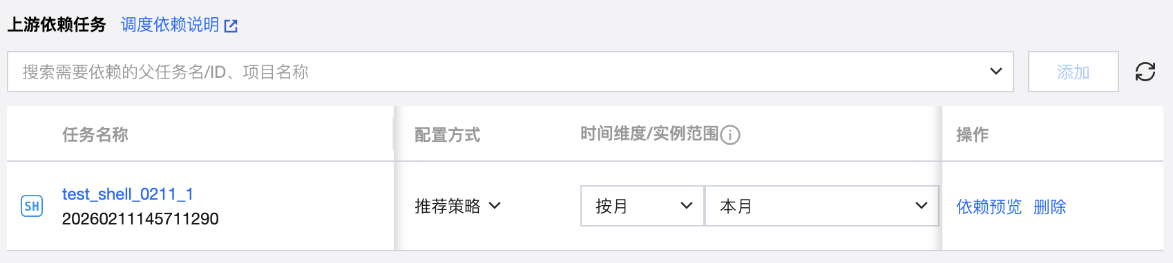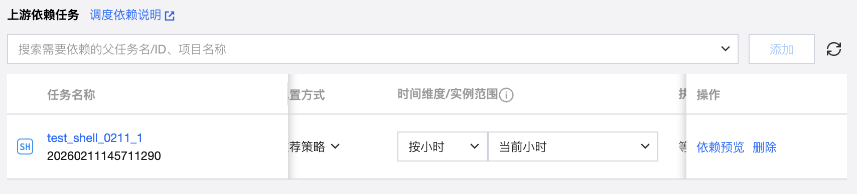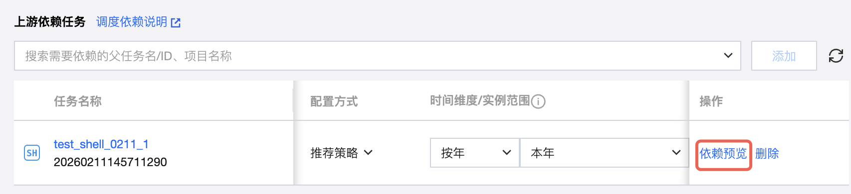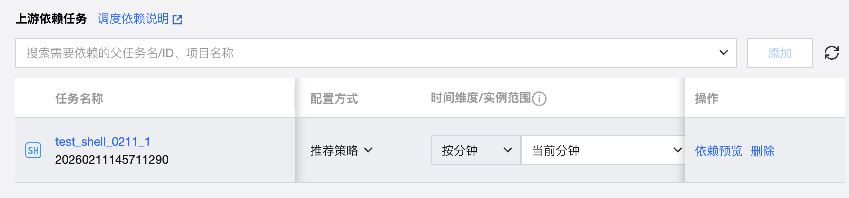 将搜索到的任务添加为依赖任务时,在依赖任务列表中会显示对应任务的信息,包括任务名称、任务状态、调度周期、负责人、所属工作流、所属项目、时间维度、实例范围、执行策略以及删除操作。