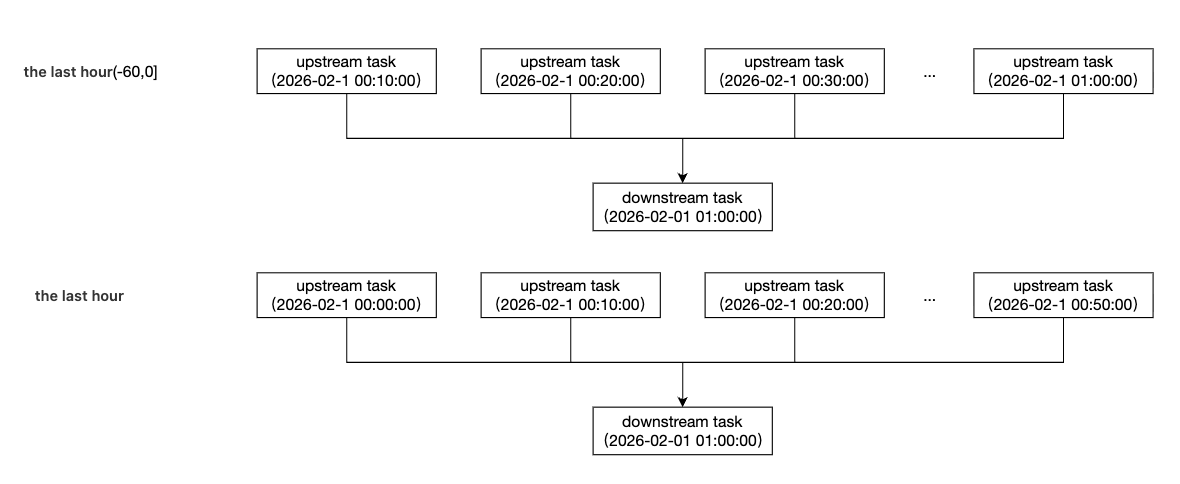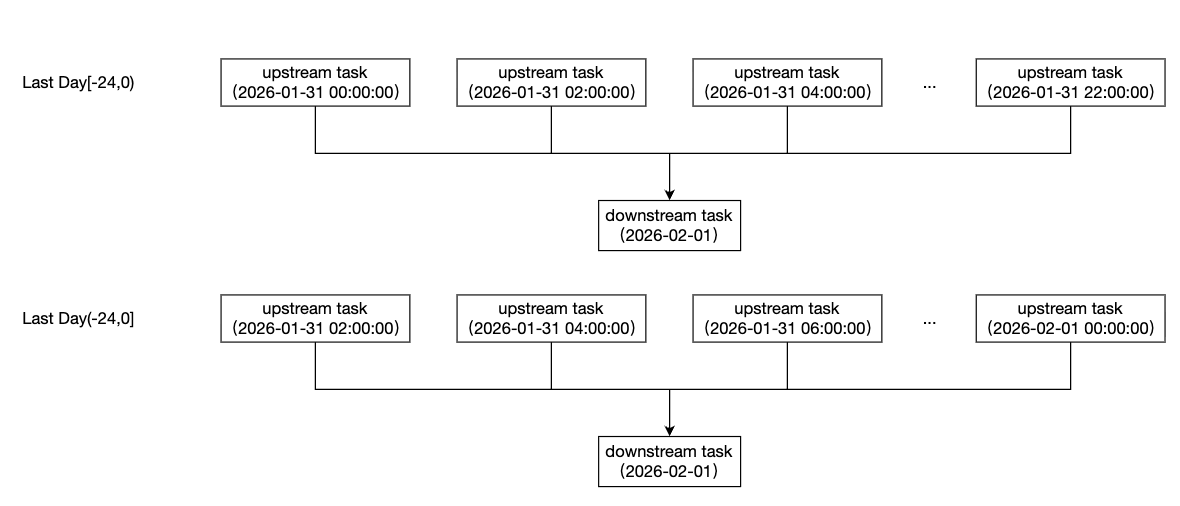 小时 | 1. 按小时/前一个小时 (-60,0]:依赖前一小时内 (-60,0] 的所有上游分钟实例。 2. 按小时/前一个小时 [-60,0):依赖前一小时内 [-60,0) 的所有上游分钟实例。 3. 按小时/当前小时:依赖当前小时内所有上游分钟实例。 |