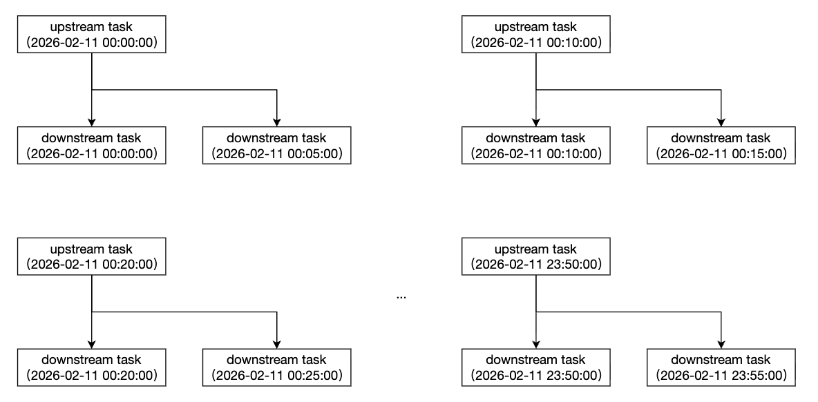 分钟依赖分钟 | 下游节点为分钟任务,每5分钟执行一次,即每小时0分、5分、10分...55分执行。上游节点为同周期分钟任务,每10分钟执行一次,即每小时0分、10分...50分执行。 ![]() | 时间维度/实例范围选择:按分钟/当前分钟,即依赖上游当前分钟对应实例。 ![]() |
