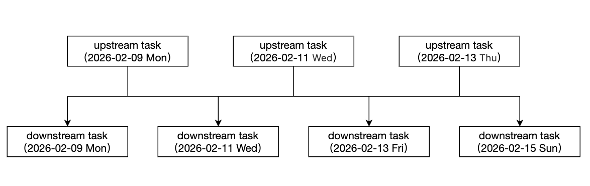 小时/分钟依赖天/周/月/年 | 小时依赖天/周/月/年、分钟依赖天/周/月/年的逻辑类似,即上游周期内所有实例都执行完成,才执行下游实例。 下面以小时依赖周为例说明: 下游节点为小时任务,每2小时执行一次。上游周任务,每周一、三、五执行。 ![]() | 时间维度/实例范围选择:按周/本周:表示上游本周实例都执行完成,才会执行下游小时任务实例。 ![]() |