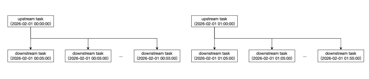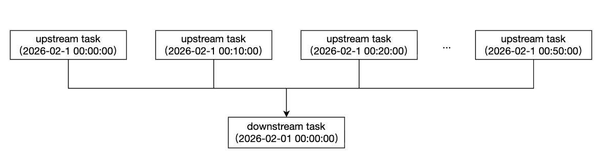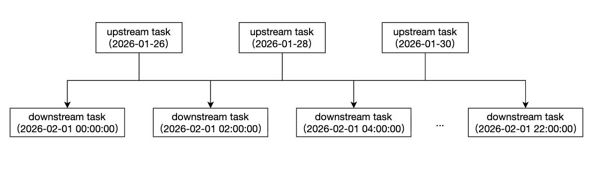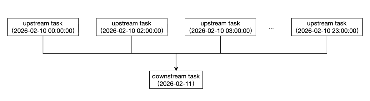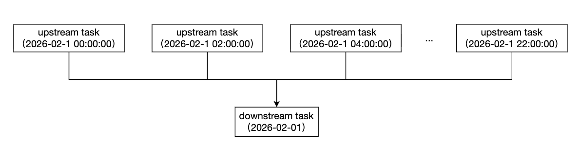 跨周期依赖是指上游和下游的调度周期不同,比如上游为天任务,下游为小时任务。