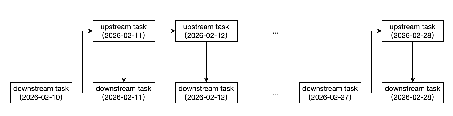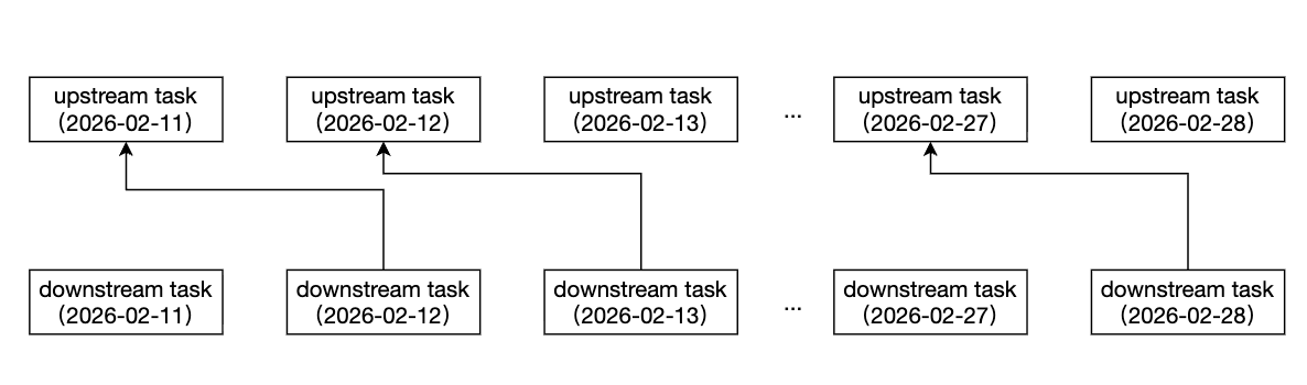 依赖逻辑:下图以上游任务依赖下游任务的上个周期实例为例,说明实例依赖关系。