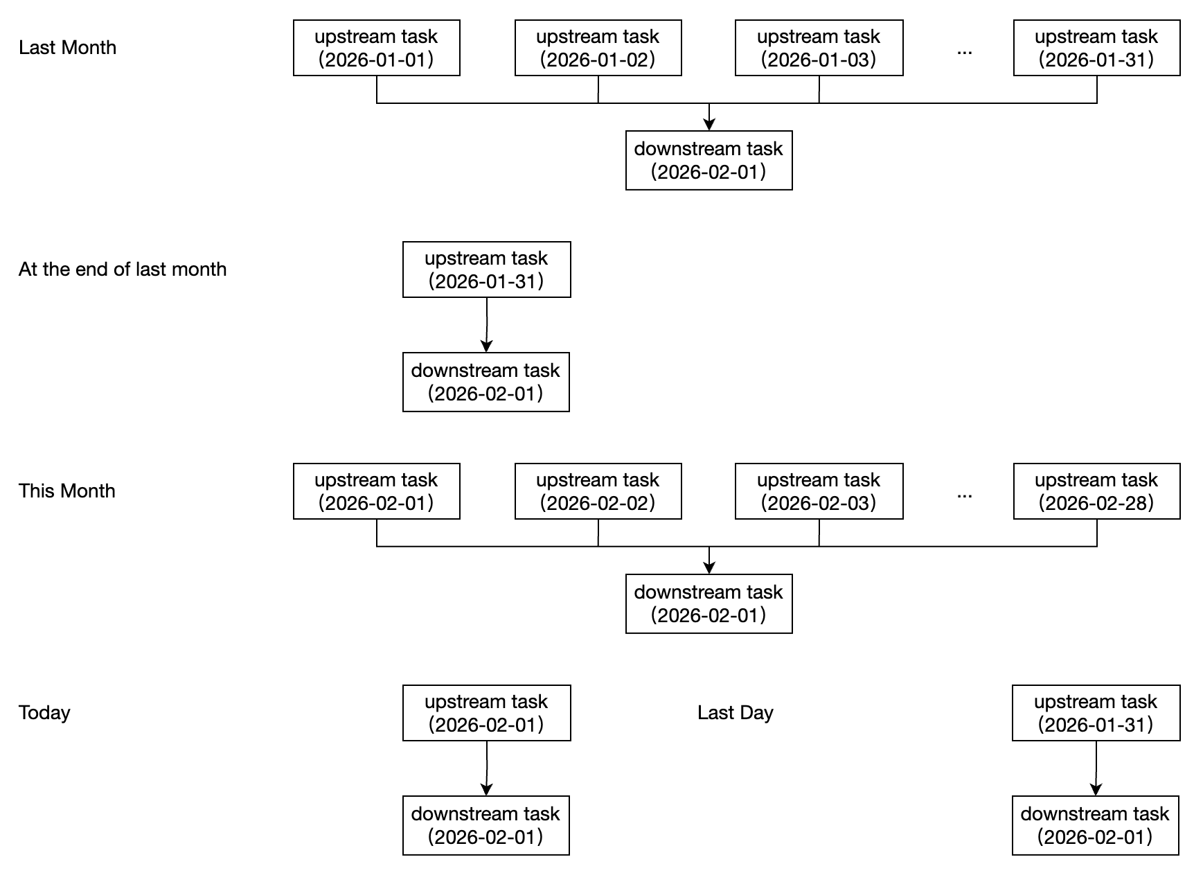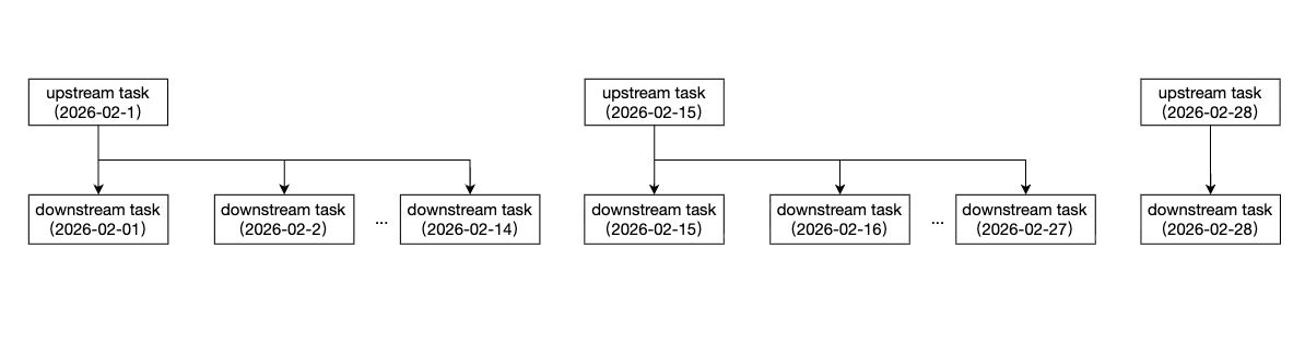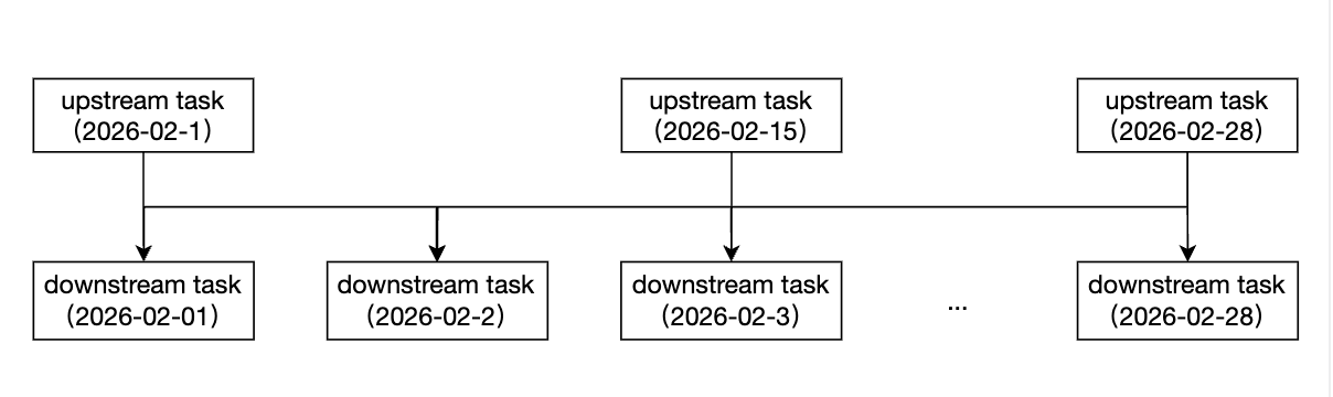月依赖天 | 月依赖天包含两种配置模式 模式一:按月配置,支持选择依赖上月所有实例、上月末实例、本月所有实例。 模式二:按天配置,支持选择依赖当天实例、依赖前一天实例。 下游节点为月任务,每月1号执行。上游节点为天任务,每天0点执行。 ![]() | 时间维度/实例范围选择:按月/上月:表示依赖上月所有实例。 时间维度/实例范围选择:按月/上月末:表示依赖上月月末实例。 时间维度/实例范围选择:按月/本月:表示依赖本月所有实例。 ![]() 时间维度/实例范围选择:按天/当天:表示依赖当天的天实例。 时间维度/实例范围选择:按天/前一天:表示依赖前一天的天实例。 ![]() |