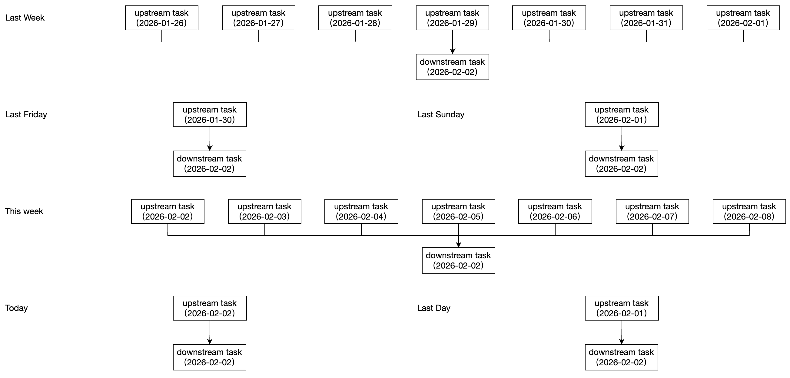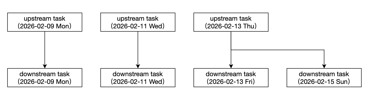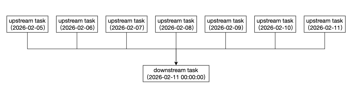 周依赖天 | 周依赖天包含两种配置模式 模式一:按周配置,支持选择依赖上周所有实例、上周五、上周日、本周所有实例。 模式二:按天配置,支持选择依赖当前实例、依赖前一天实例。 下游节点为周任务,每周一执行。上游节点为天任务,每天0点执行。 ![]() | 时间维度/实例范围选择:按周/上周:表示依赖上周所有天实例。 时间维度/实例范围选择:按周/上周五:表示依赖上周五实例。 时间维度/实例范围选择:按周/上周日:表示依赖上周日实例。 时间维度/实例范围选择:按周/本周:表示依赖本周所有天实例。 ![]() 时间维度/实例范围选择:按天/当天:表示依赖当天的天实例。 时间维度/实例范围选择:按天/前一天:表示依赖前一天的天实例。 ![]() |