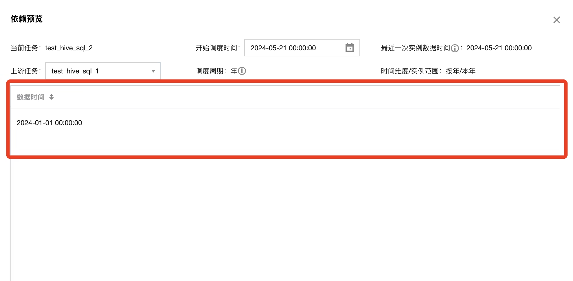 支持根据配置的依赖关系进行依赖结果预览,辅助用户判断配置的依赖关系是否符合预期。可选择开始调度时间,查看对应实例数据时间依赖实例列表(实例数据时间)。