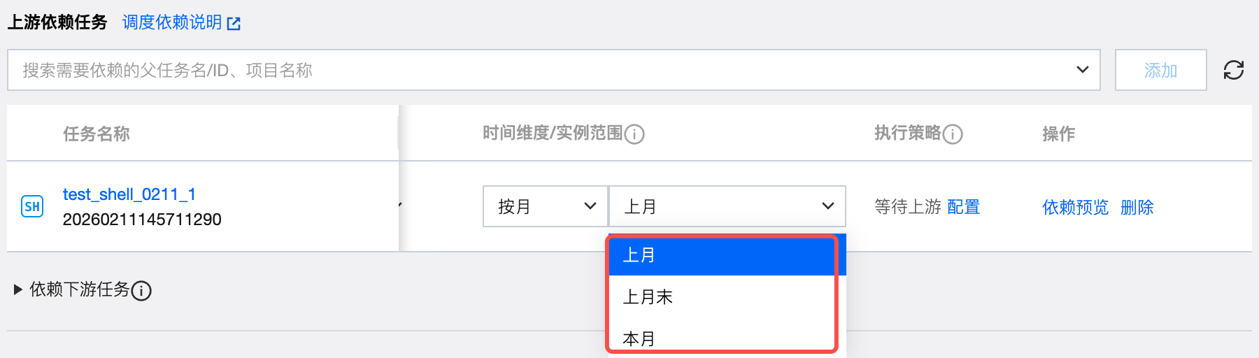 月 | 1. 按月/上月:依赖上月所有天实例。 2. 按月/上月末:依赖上月最后一天的天实例。 3. 按月/本月:依赖本月所有天实例。 4. 按天/当天:依赖当天的天实例。 5. 按天/前一天:依赖前一天的天实例。 |