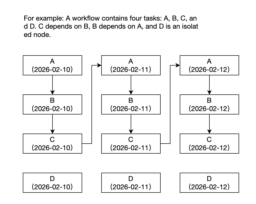 举例:工作流中仅包含A、B、C、D四个任务,其中C依赖B、B依赖A,D为孤立节点。若工作流配置为自依赖,则工作流中A任务下个周期的实例依赖C任务上个周期的实例,因为D任务为孤立节点,则不参与工作流自依赖。