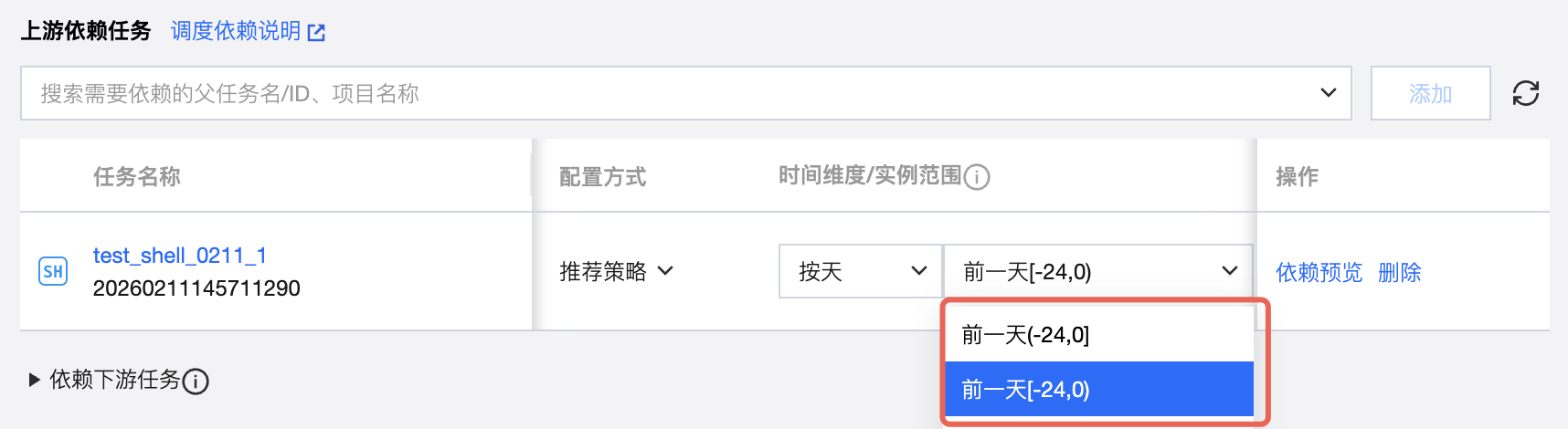 区间模式:输入格式为:x,y 。表示依赖上游任务实例数据时间偏移的范围。例如区间(天)的情况下,输入了-10,-1 ,表示依赖上游任务前10天到前1天的闭区间实例。x<=y,且最大差值为1000。