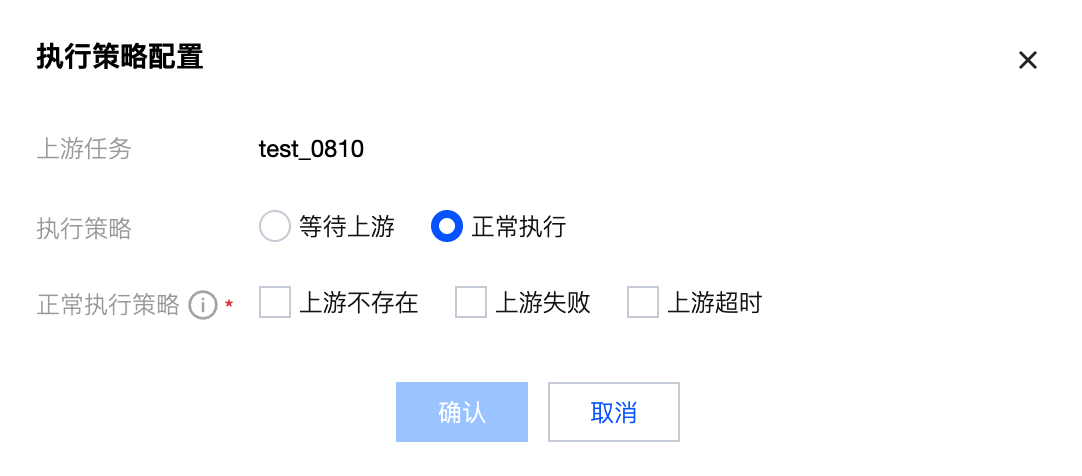 依赖的上游任务实例不存在时处理策略,默认为等待上游;选择等待上游表示上游任务实例不存在时持续等待,选择正常执行可在上游任务实例不存在、上游任务失败、上游超时三种状态下正常执行。上游不存在表示上游实例时间不在生效时间范围内;上游失败表示上游执行状态为失败;上游超时(仅针对周期执行生效)表示上游超过配置阈值实例还未成功。