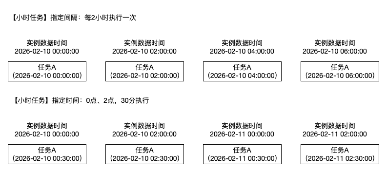 执行时间(与指定时间二选一) | 执行时间 小时任务执行时间可选择时分,间隔范围:1 - 12小时,任务根据执行时间生成实例进行调度。 间隔时间 以设定的间隔时间为单位,在指定的执行时间区间内控制任务的实例生成频率。 |