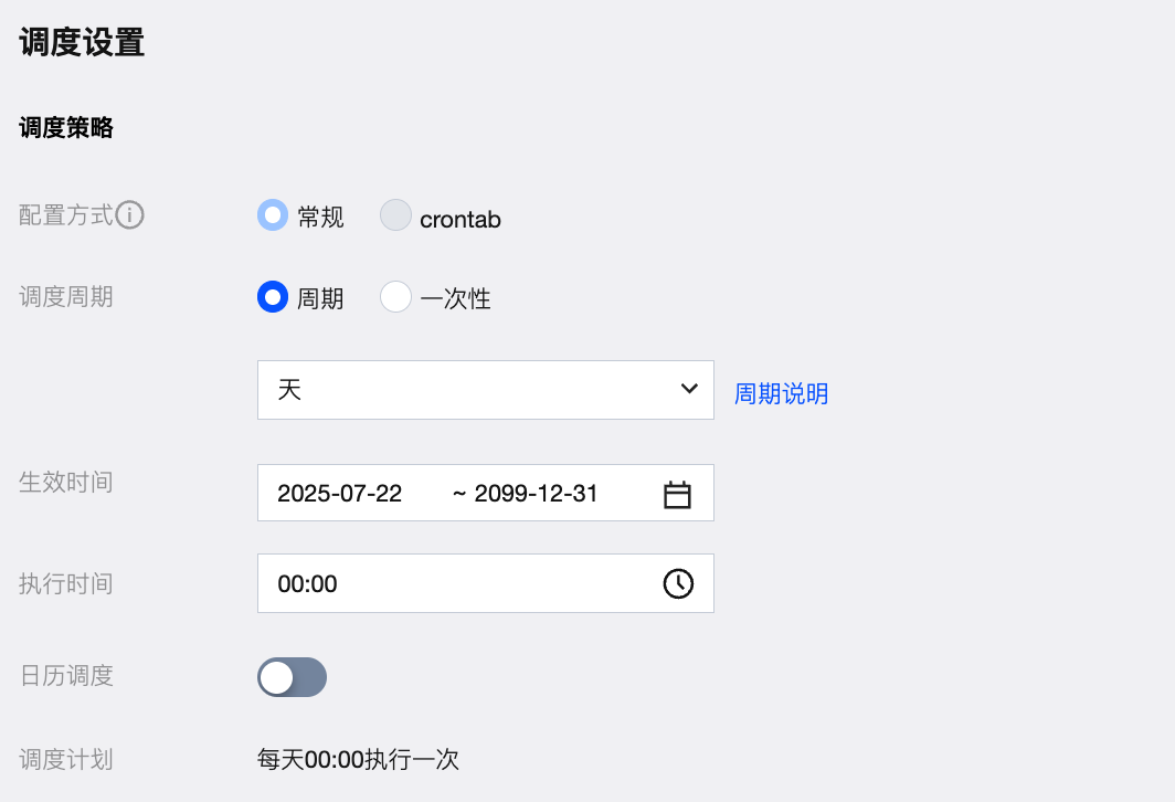 配置方式-调度周期 | 配置方式选择常规,调度周期选择周期-天。 |