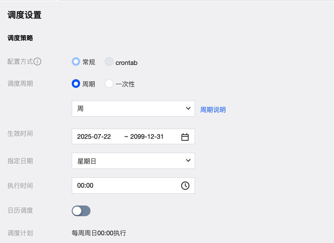配置方式-调度周期 | 配置方式选择常规,调度周期选择周期-周。 |