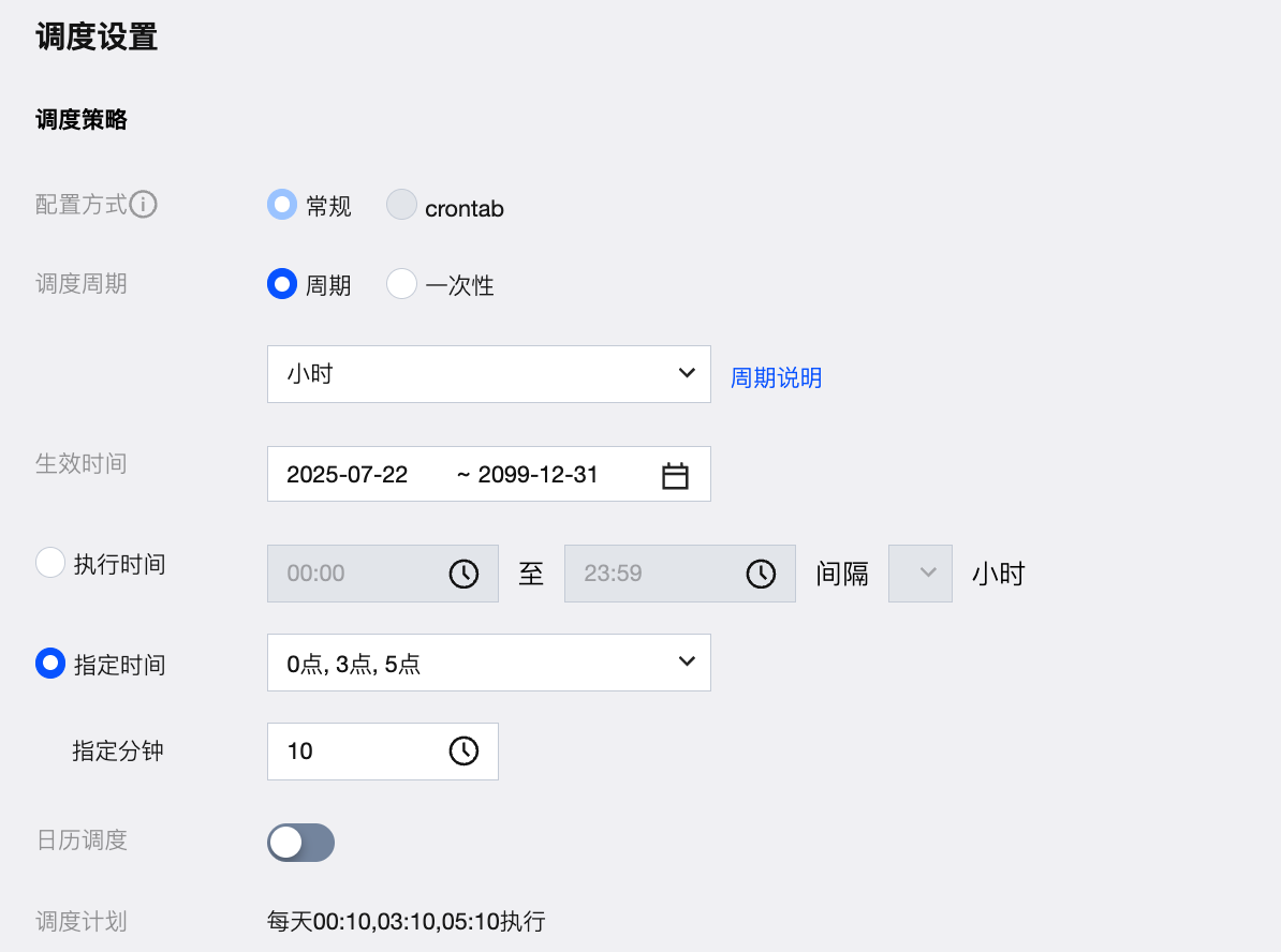 配置方式-调度周期 | 配置方式选择常规,调度周期选择周期-小时。 |