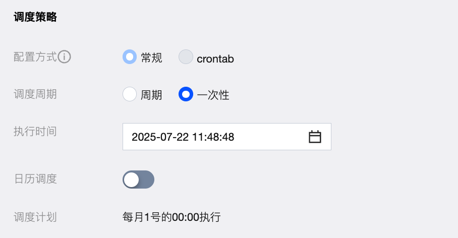 配置方式-调度周期 | 配置方式选择常规,调度周期选择一次性 |
