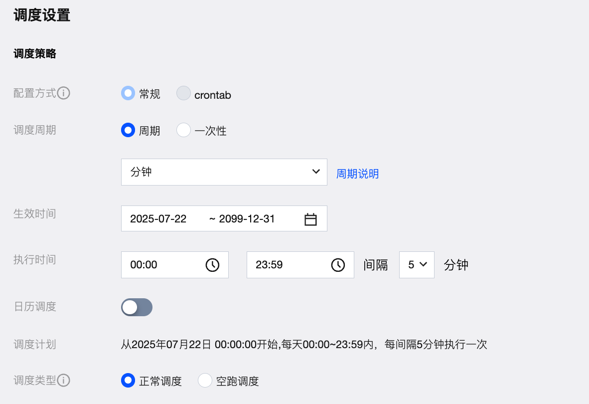 配置方式-调度周期 | 配置方式选择常规,调度周期选择周期-分钟。 |