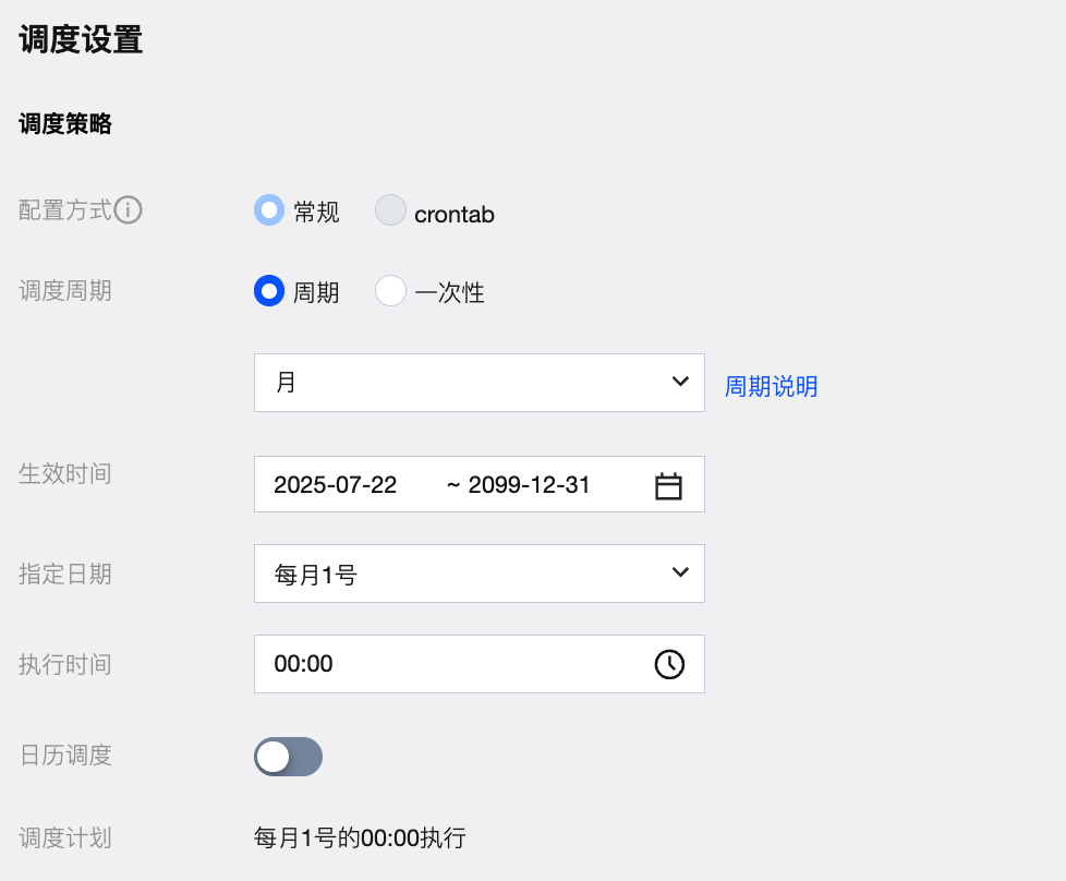 配置方式-调度周期 | 配置方式选择常规,调度周期选择周期-月 |