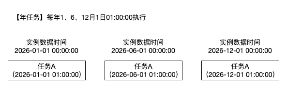 执行时间 | 年任务执行时间可选择时分, 生成的实例到达指定月份指定日期的执行时间后开始执行。 |