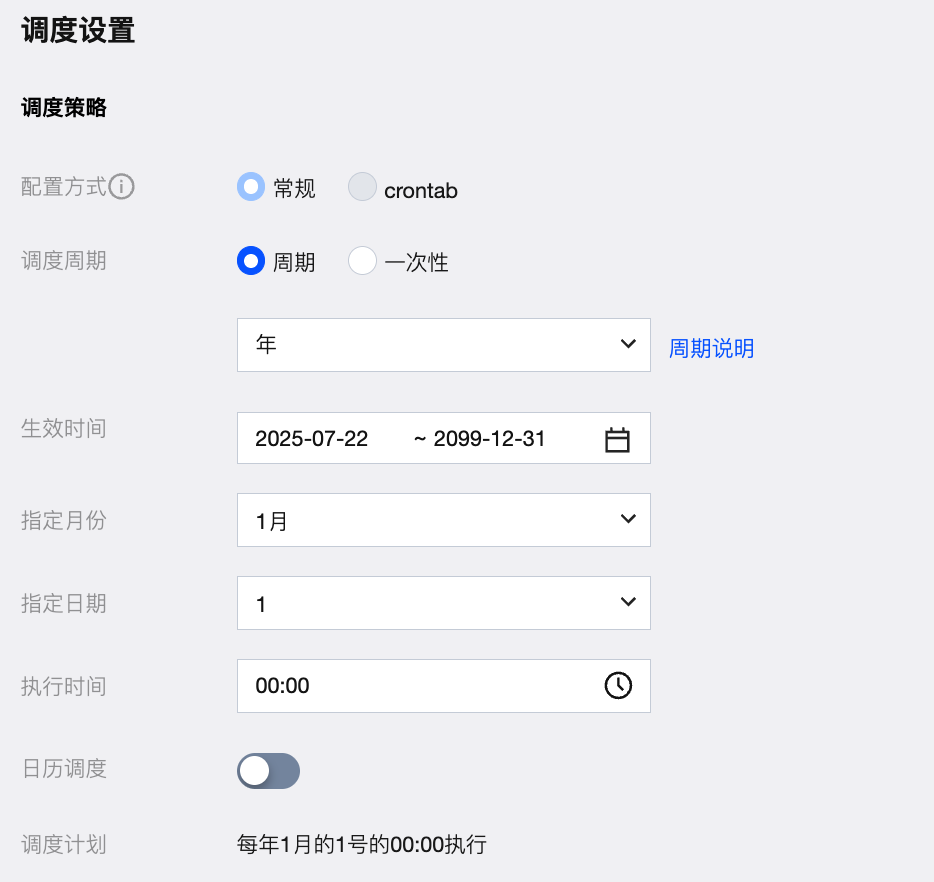 配置方式-调度周期 | 配置方式选择常规,调度周期选择周期-年 |
