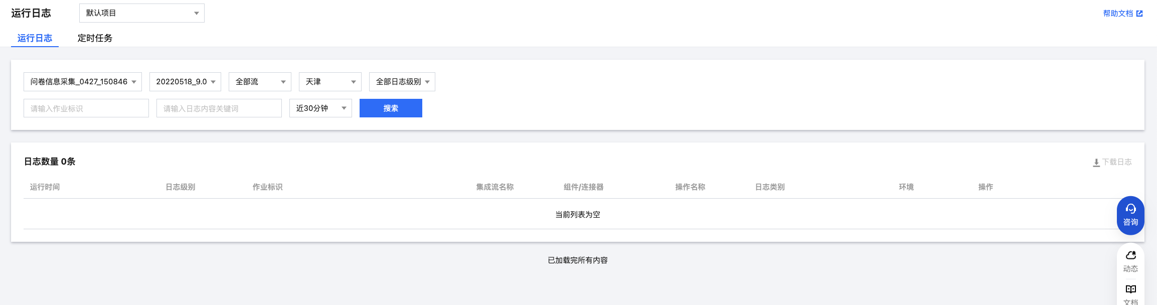 3. 在运行日志页面,您可查看当前运行应用、当前运行版本的近30分钟的日志。