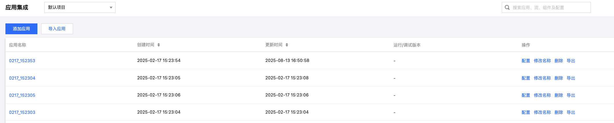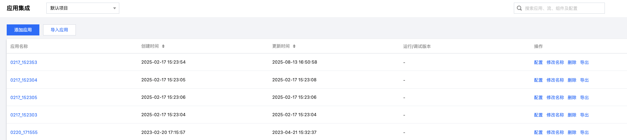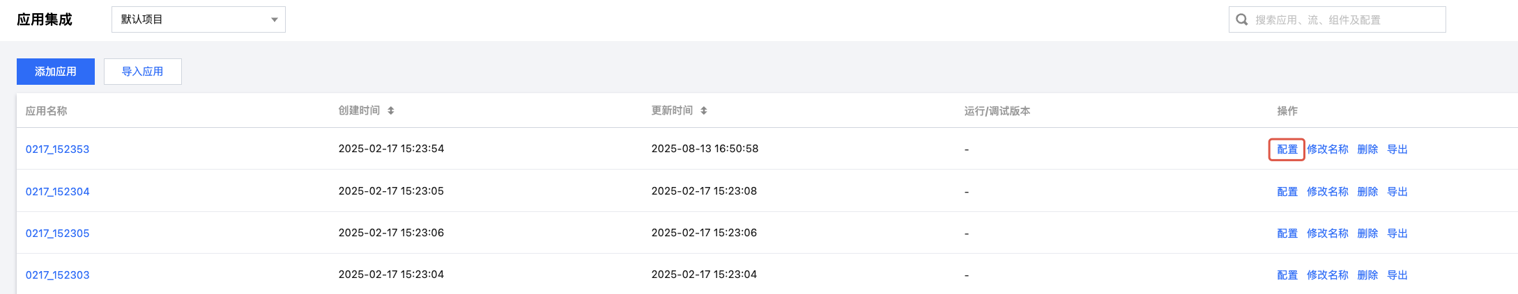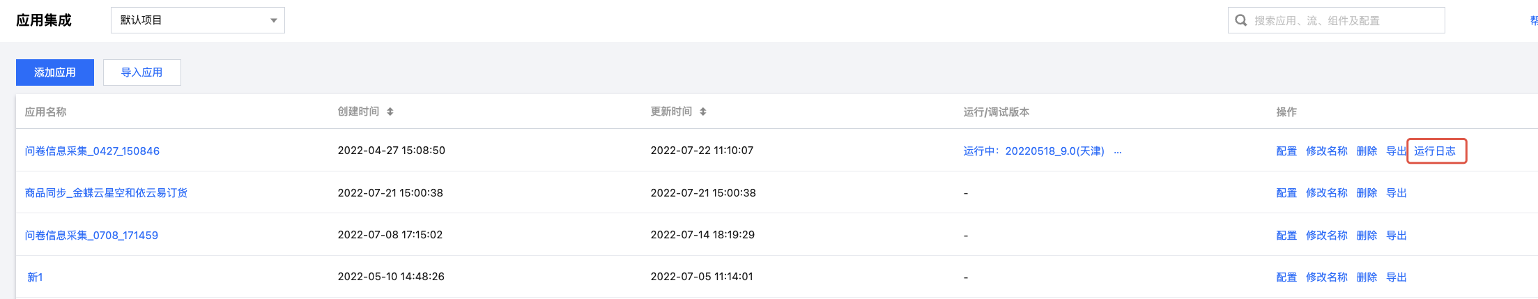 2. 在应用集成页面,找到目标应用,单击操作列的运行日志。
