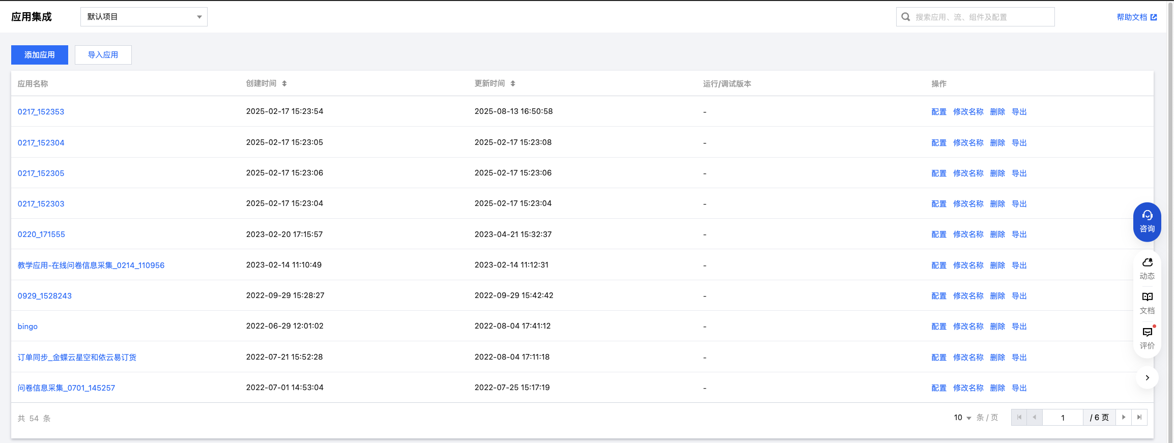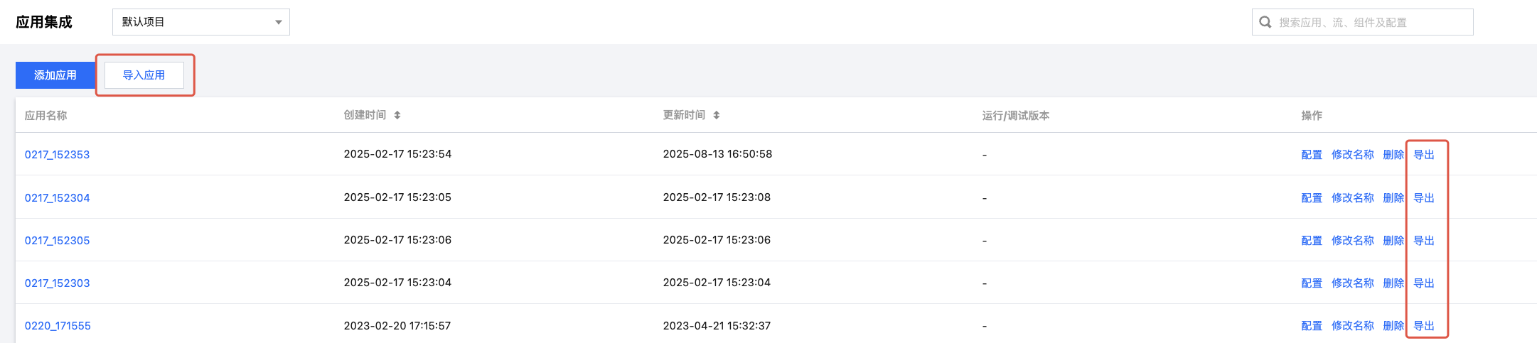 2. 在应用集成页面,找到目标应用,单击左上角导入应用或应用项目操作列的导出即可完成操作。