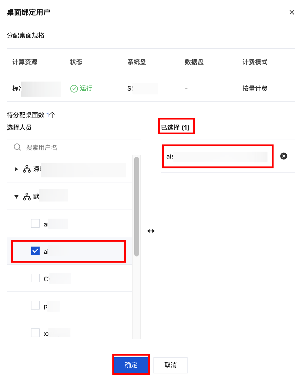 3. 在桌面绑定用户操作栏的左侧,根据部门结构选择人员,单击确定后绑定。