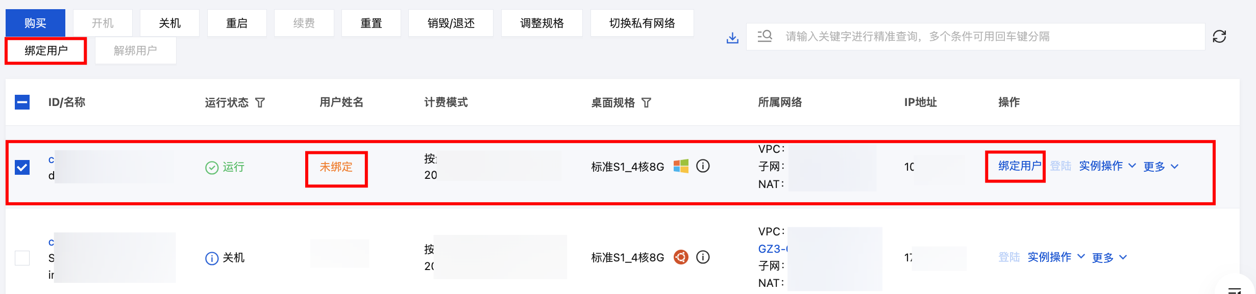 2. 在桌面列表中,选择您需要操作的未绑定用户姓名的云桌面,在上方操作栏或直接在对应桌面右侧菜单栏单击绑定用户。