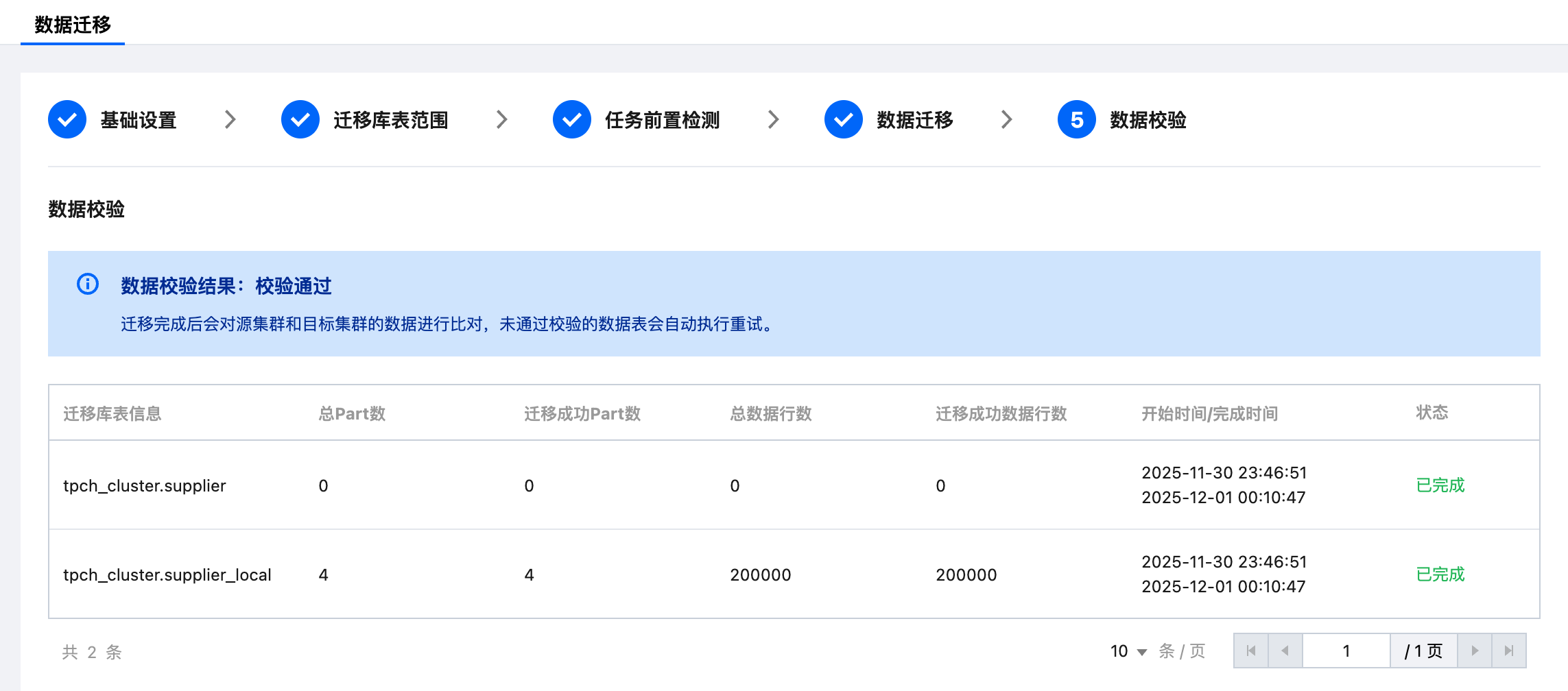 8. 当源集群和目标集群的存量及增量数据完全追齐后,可开启数据校验阶段,系统会对源集群和目标集群的数据进行比对,包括总的Part数、迁移成功Part数、总数据行数、迁移成功数据行数,未通过校验的数据表会自动执行重试。