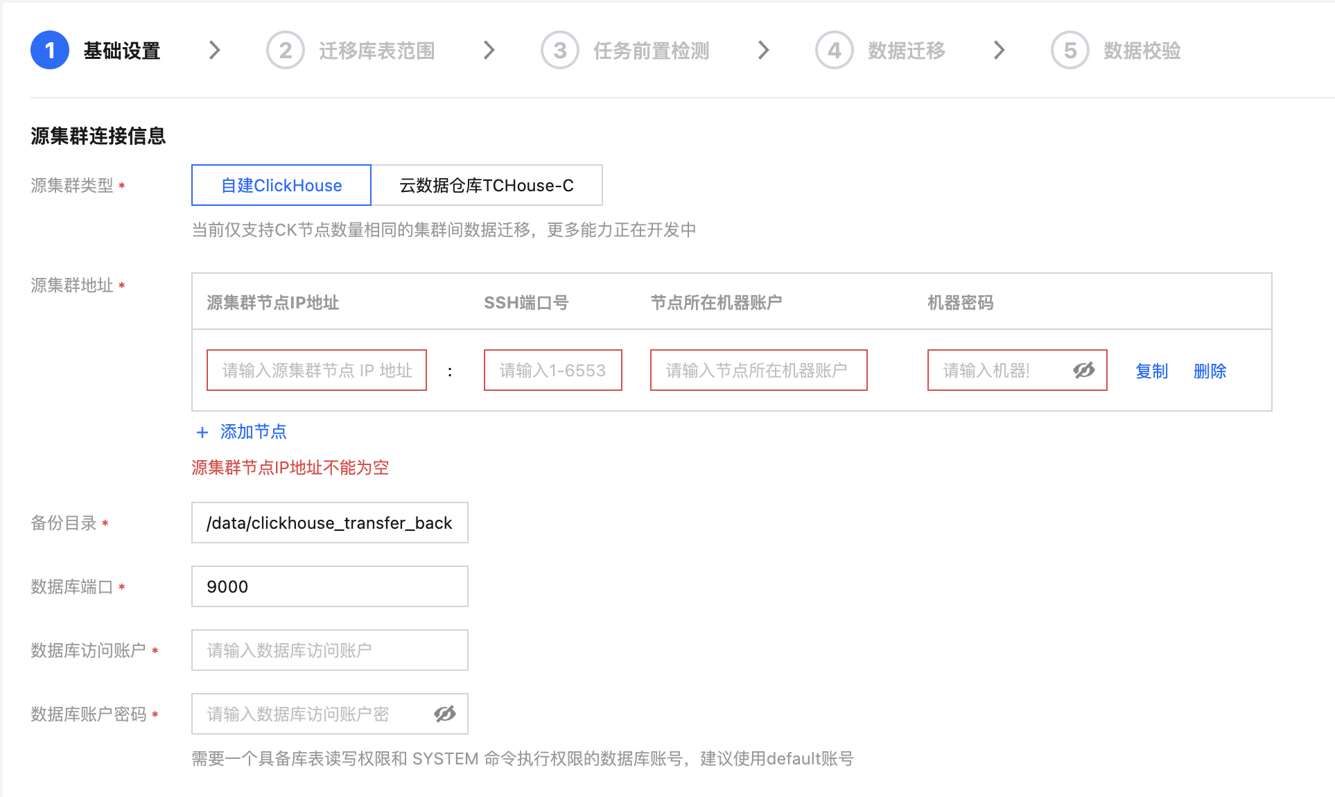 源集群地址:需要填写 CK 节点所在集群的 IP 地址、SSH 端口号、节点所在机器的账户名及密码,源集群有多个节点时需要填写所有节点的信息;