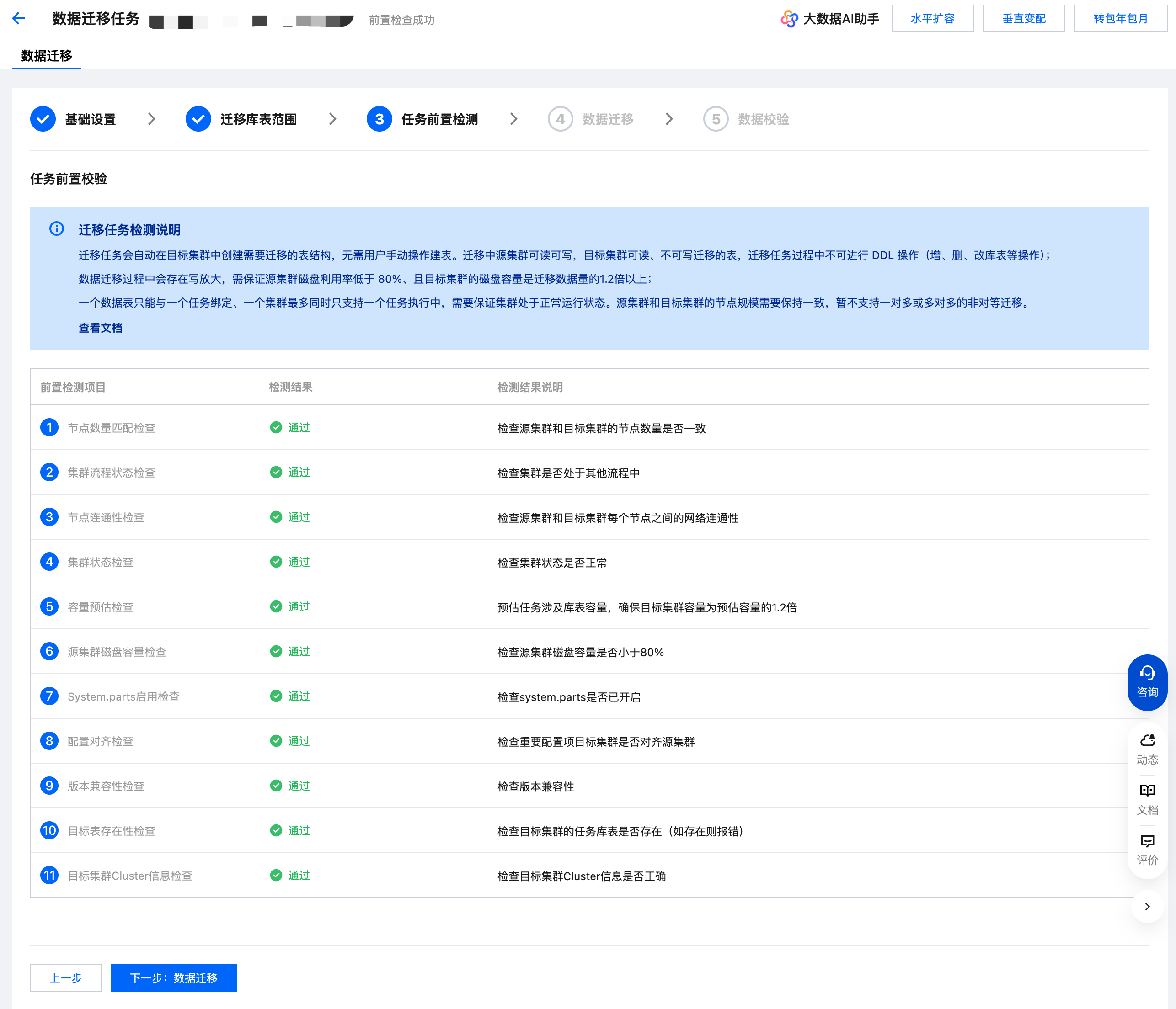 5. 单击 下一步:任务前置检测,会自动进行集群迁移的前置检测,按照集群规模和库表数据量大小,前置检测将持续 1-5 分钟,前置检测过程中会异步更新每一检测项的检测结果,只有当全部检测项都通过时才可发起后续的数据迁移操作。如果某些检测项未通过,可调整该检测项后发起重试。