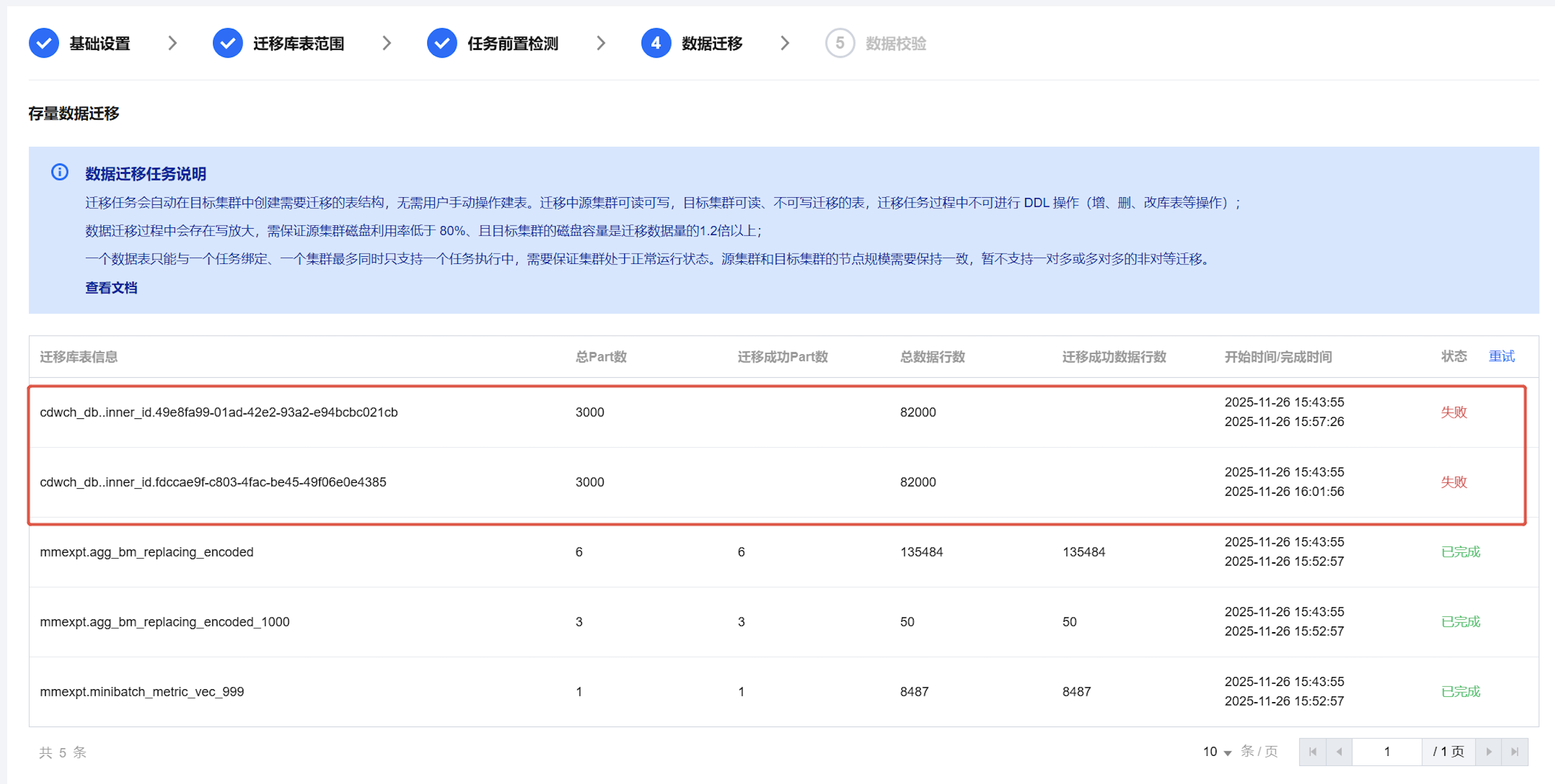 部分迁移的库表数据量较大时、由于网络抖动影响,迁移过程中可能会产生迁移失败的情况,单击重试即可。