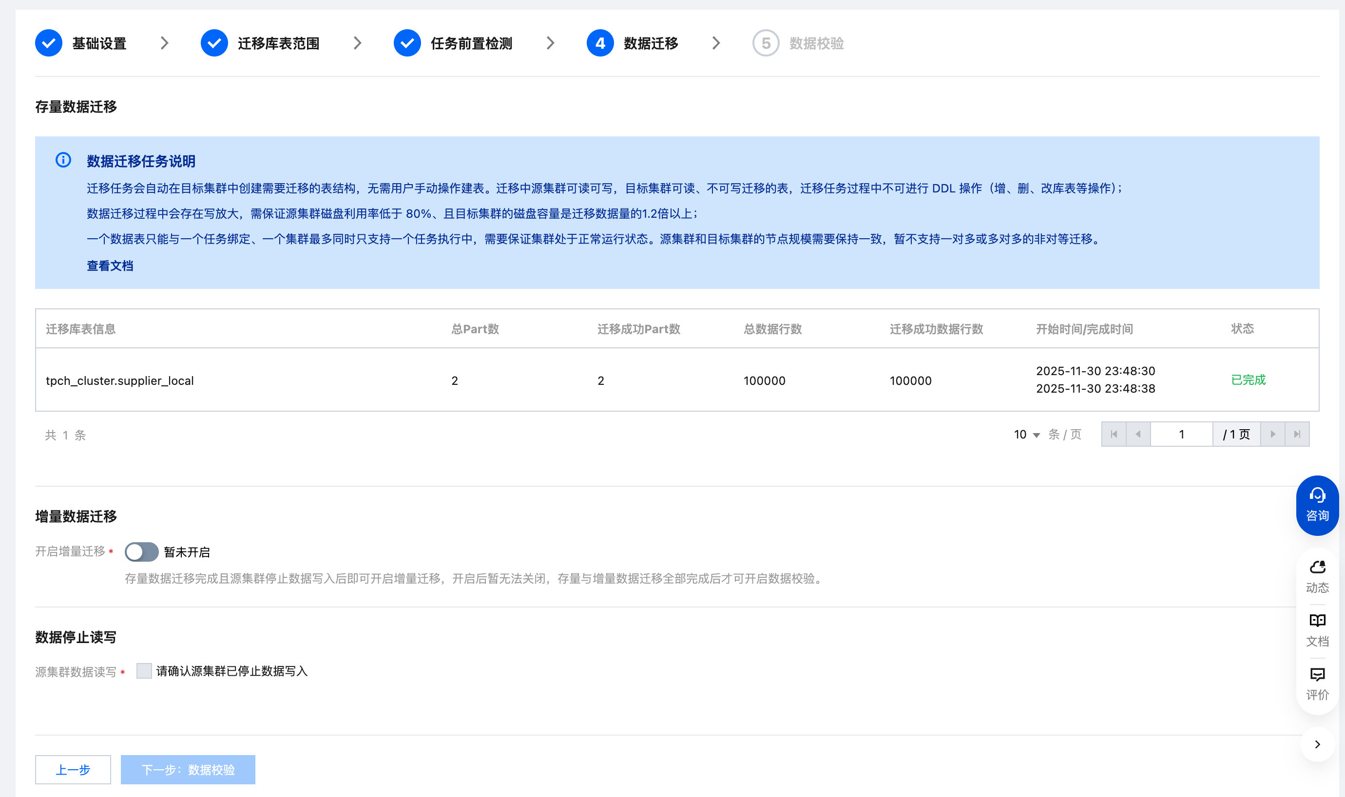 6. 单击 下一步:数据迁移,系统将开启正式的数据迁移。迁移过程中,源集群可正常读写,目标集群可读、但不可写迁移的表,避免数据校验无法通过。受迁移数据总量、网络带宽、CK 节点规模、集群负载、磁盘 IO 等多方面因素影响,数据迁移任务将持续数分钟到数小时不等,系统后台将异步刷新迁移进度。数据迁移分为存量数据迁移和增量数据迁移两个阶段,当存量数据迁移完成后,迁移状态一栏会显示 已完成,届时可以操作进行增量数据迁移。
