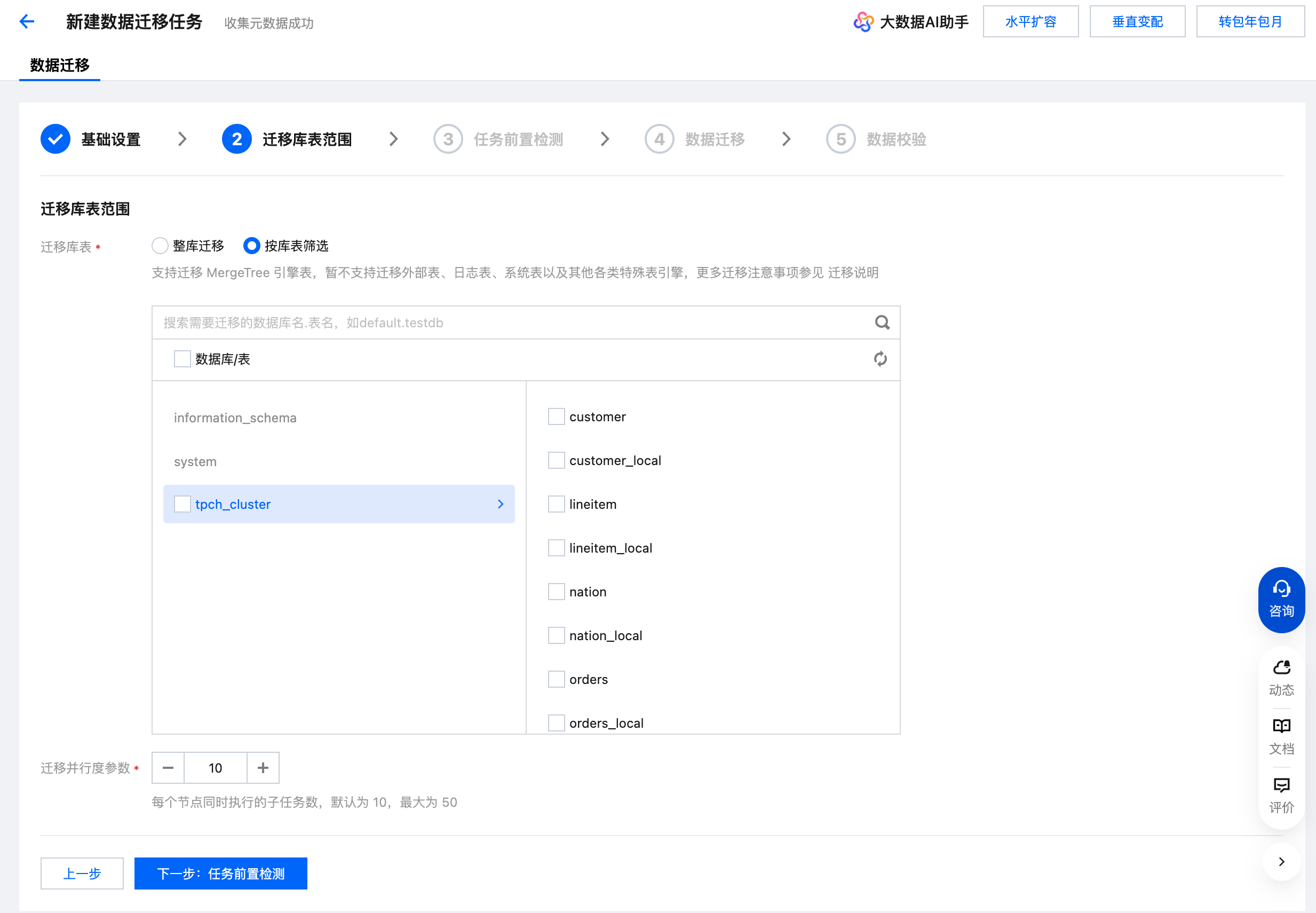 4. 单击 下一步:迁移库表范围,系统会自动采集源集群的元数据库表信息。当库表数量较大时,采集元数据需要等待 1-2 分钟。当前支持的迁移粒度包括 整库迁移 和 按库表范围,选择 整库迁移 会自动选择源集群 default_cluster 下的所有 MergeTree 引擎表(含本地表、分布式表、副本表以及物化视图表),选择 按库表迁移 可按表进行筛选需要迁移的表范围,支持通过表名进行搜索。迁移并行度参数为每个节点同时执行的子任务数,默认为 10(在网络带宽和磁盘 IO 未跑满时,调整该参数可提升迁移速度,一般场景下保持默认值即可)。